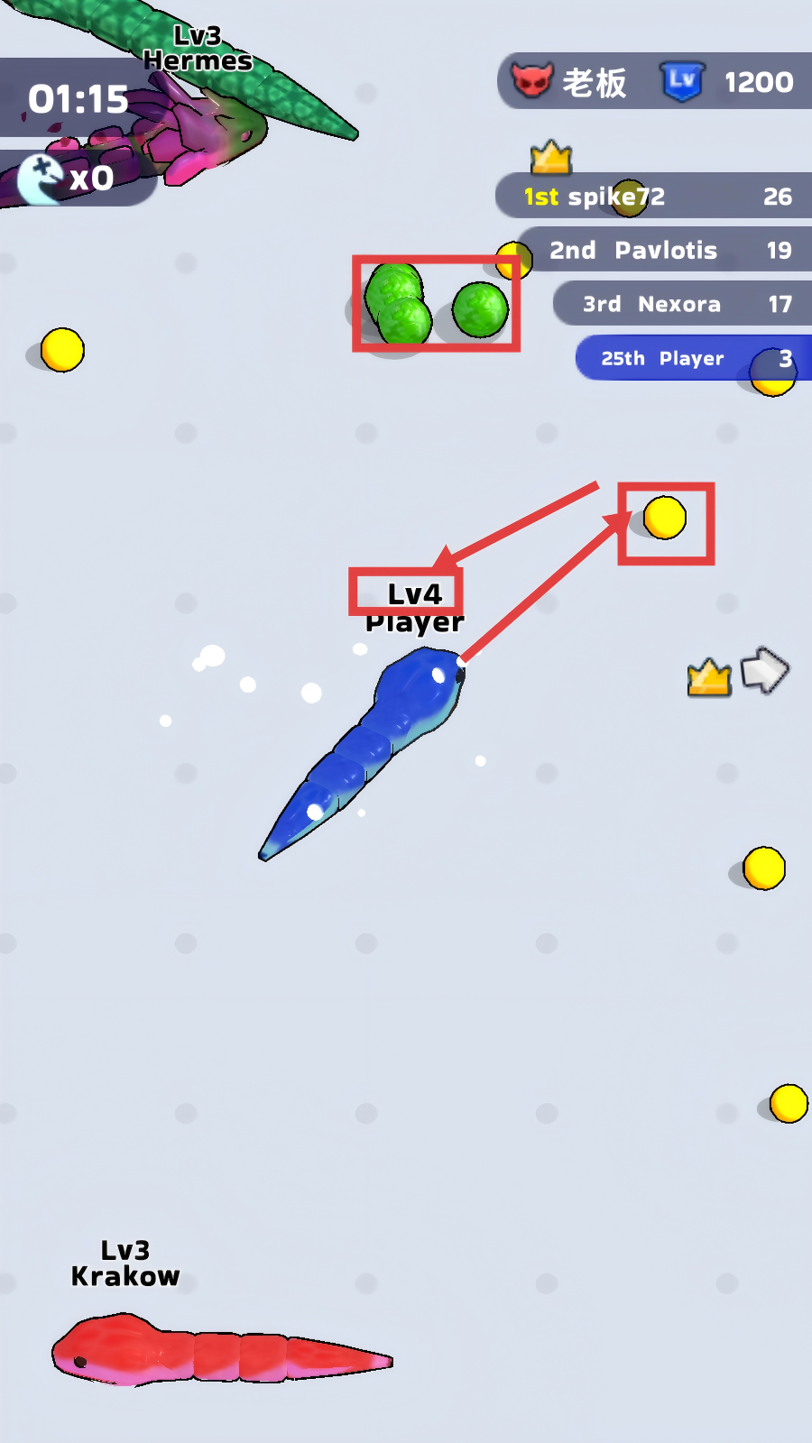 2、冒险中优先收集黄色小球与绿色球体,让角色升级(如从Lv4提升),增强自身实力。
