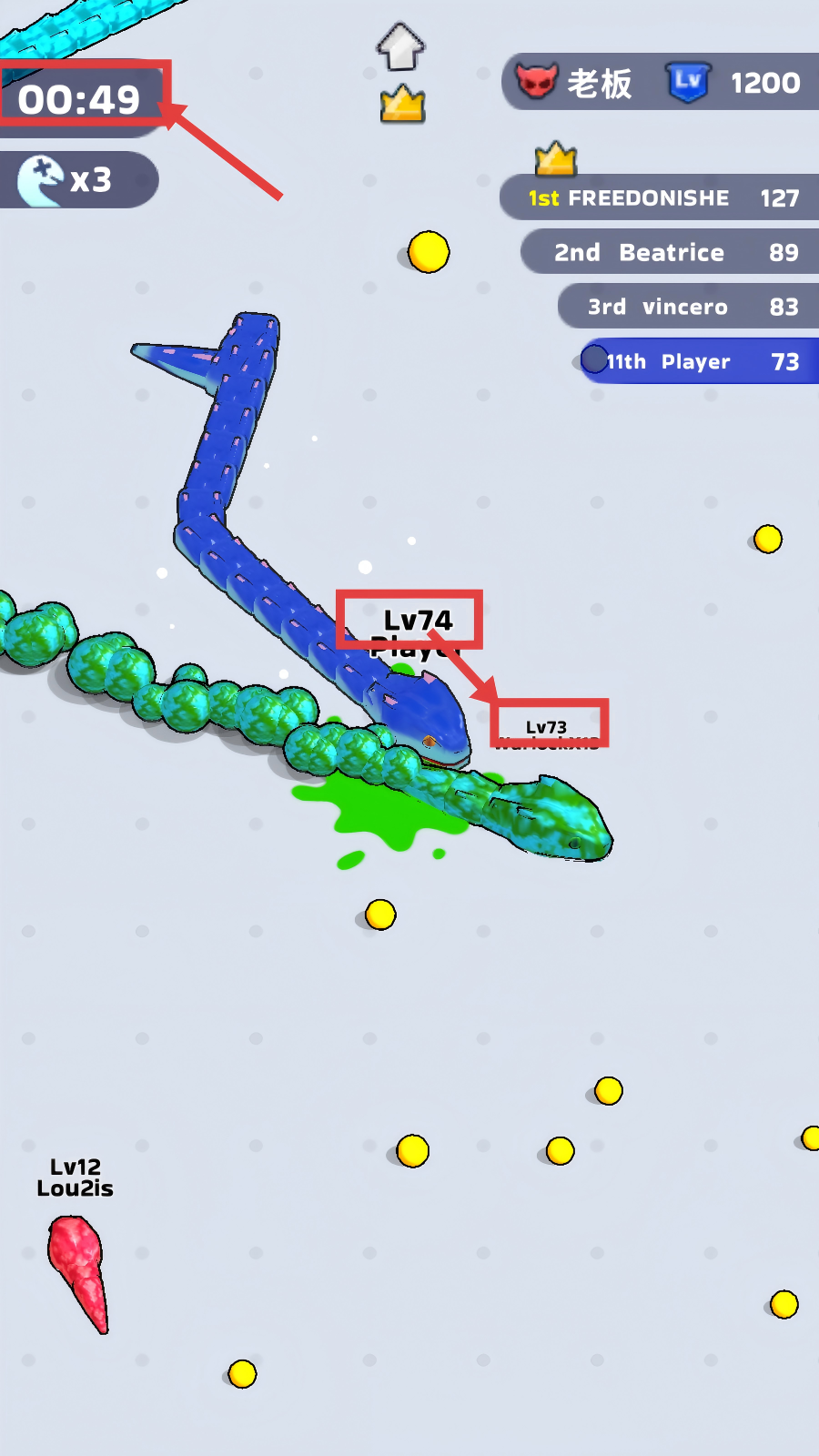 3、留意左上角倒计时(如00:49),利用等级优势(如Lv74对战Lv73),主动攻击低等级敌人获取资源。