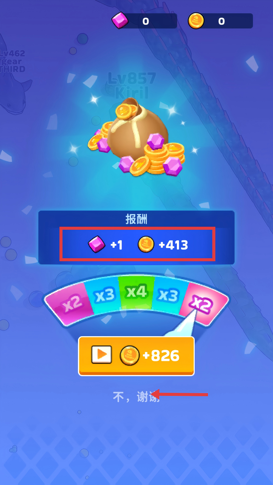 4、结算时可获得【+1】宝石、【+413】金币等报酬,若不想看广告加倍,点击【不,谢谢】即可。