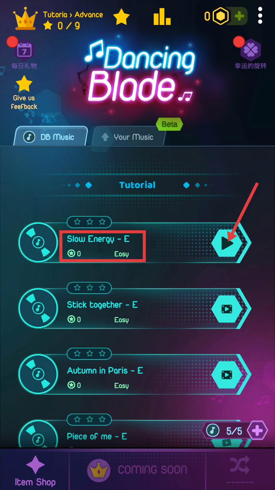 1、进入《DancingBlade》游戏,选择【SlowEnergy-E】这首Easy难度的歌曲,点击右侧箭头图标开启游戏。