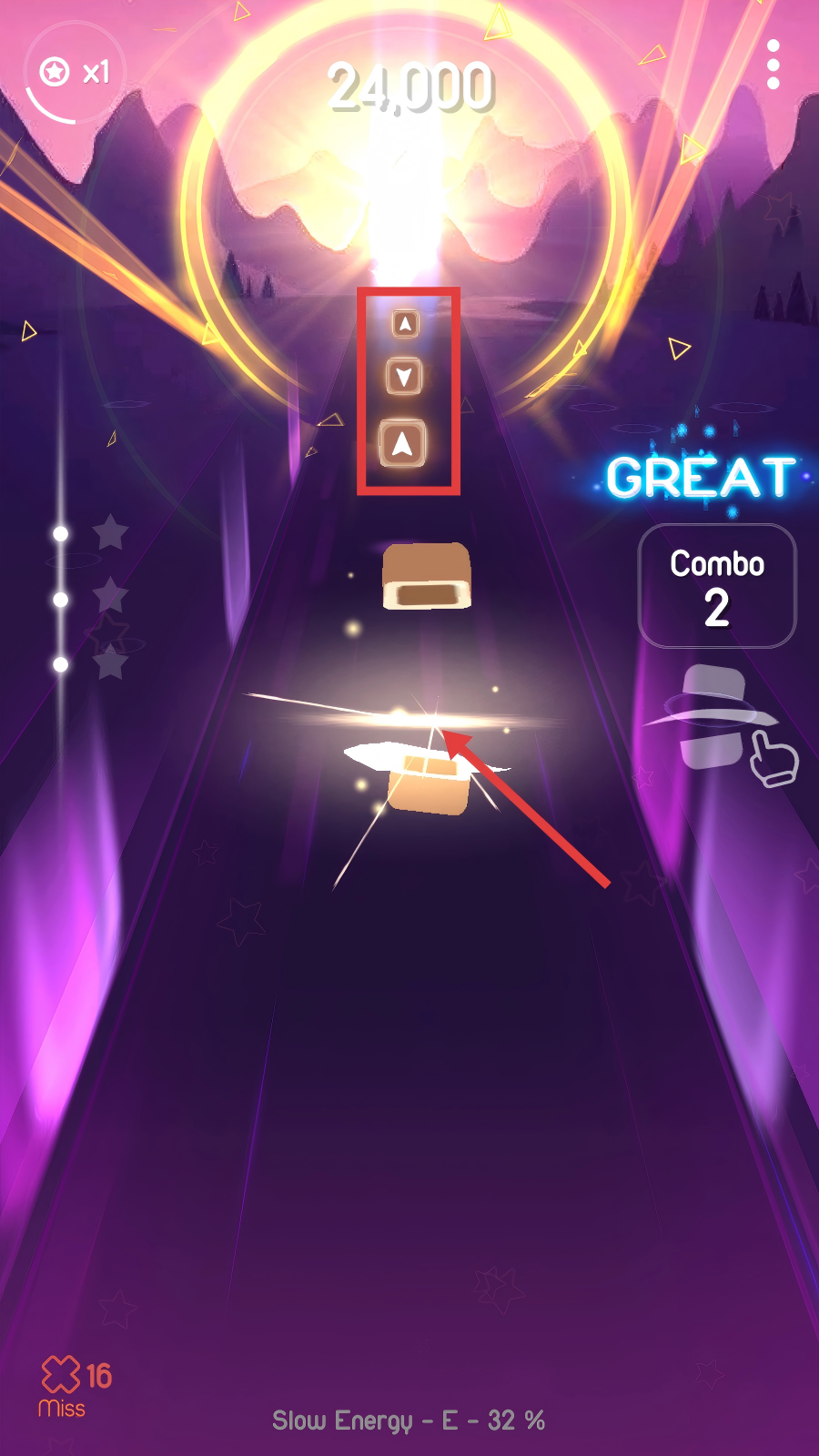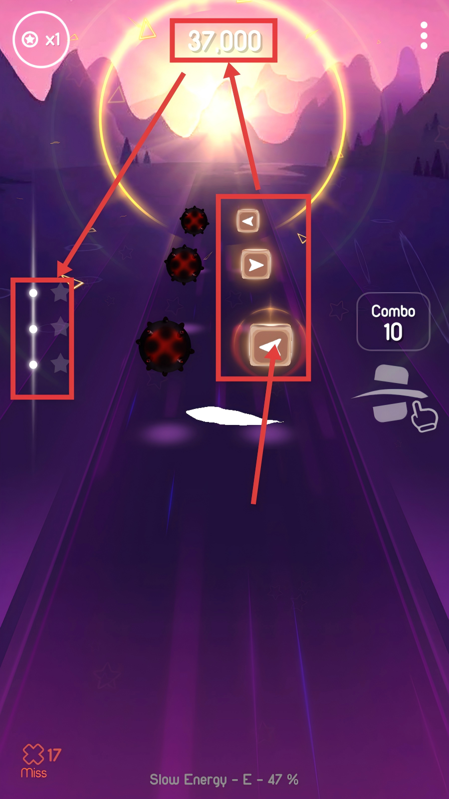 3、注意左侧星星进度和上方分数,躲避红色【叉叉】图案的炸弹,滑动消除方向标的方块,提升Combo数,让得分持续增长。