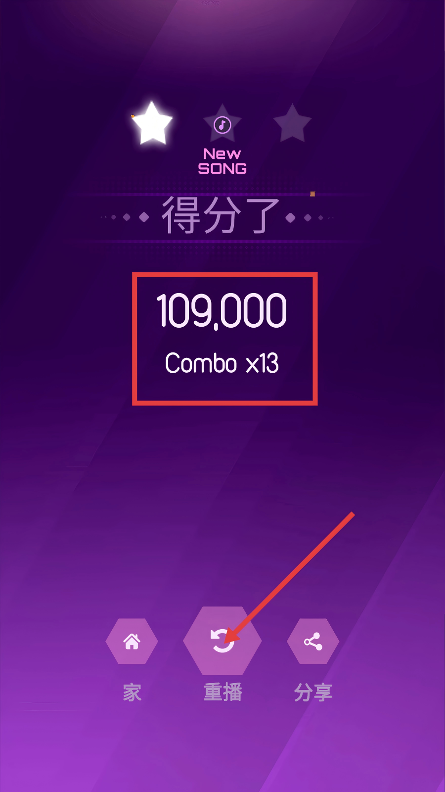 4、歌曲结束后,若获得如109,000分且Combox13的成绩,可点击【重播】按钮再次挑战,冲击更高分数与星级。