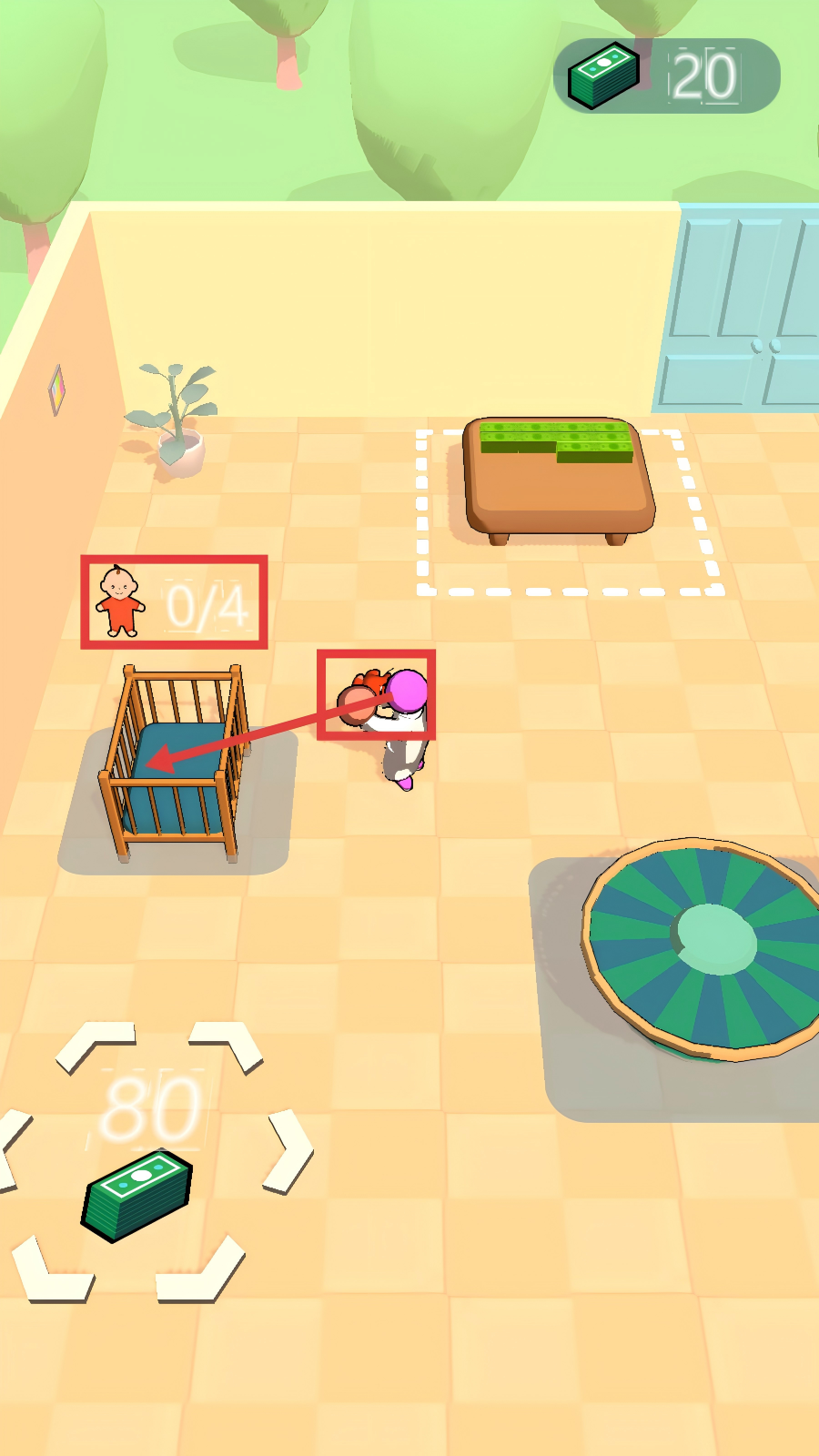 3、接着瞄准【婴儿床】,放入手中物品,继续推进【0/4-婴儿】的任务。