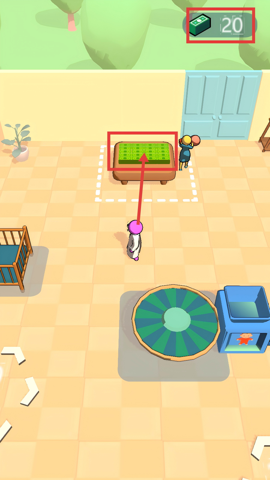 4、最后前往【装满钱的桌子】互动,获取收益,此时显示【20-金钱】,积累资源。