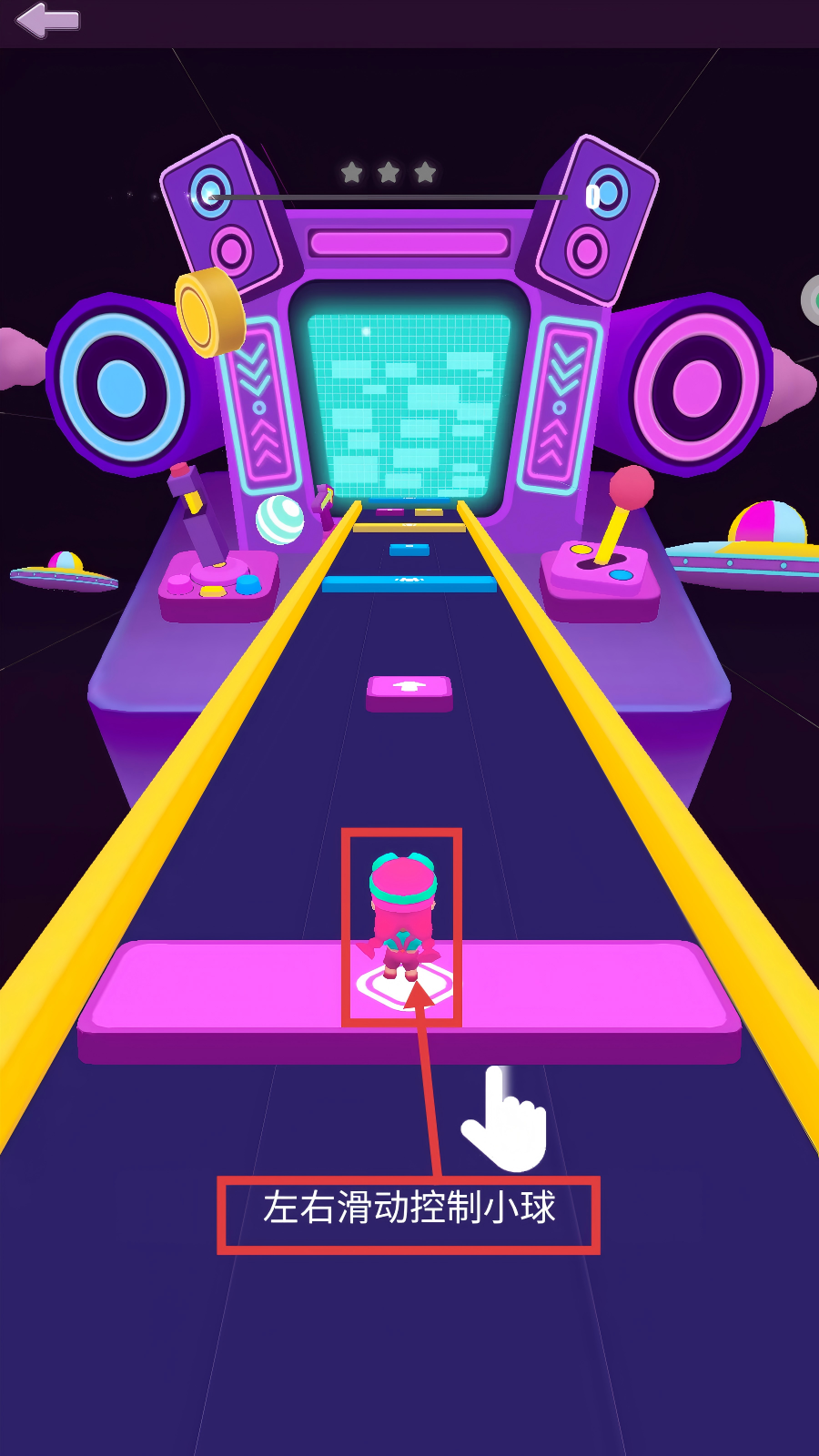 1、开始时通过左右滑动屏幕,控制小球在轨道上移动,为后续踩方块做准备。