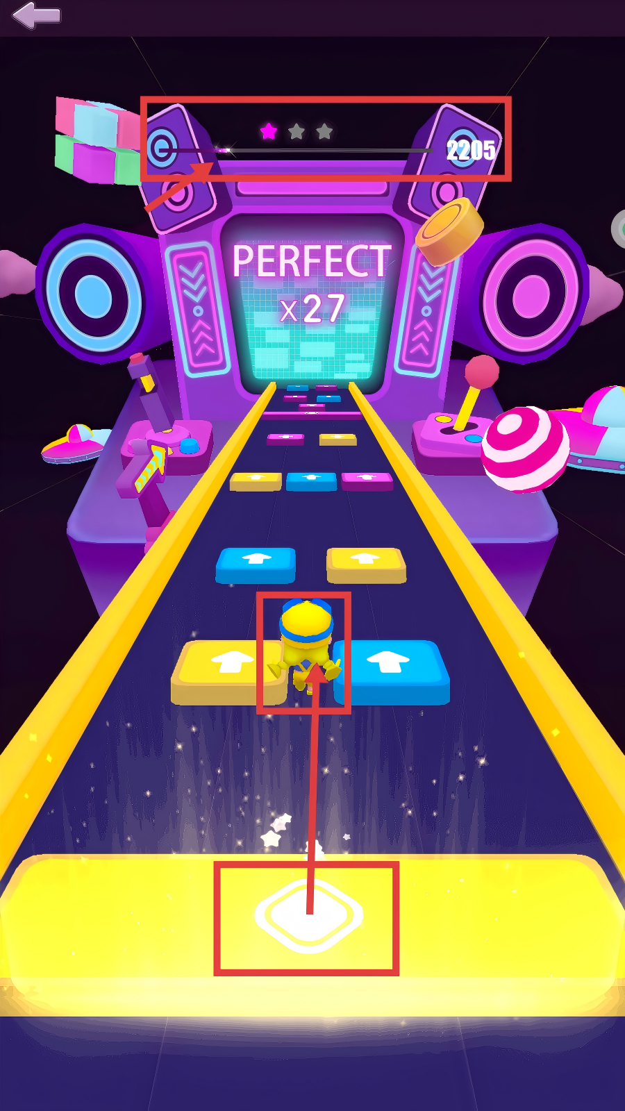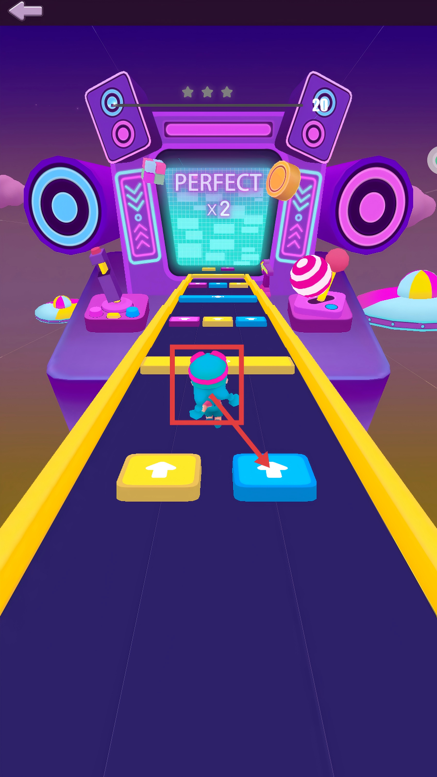2、在轨道上出现不同颜色带箭头的方块时,操控小球踩到对应方块,可触发【PERFECT】判定,积累连击。