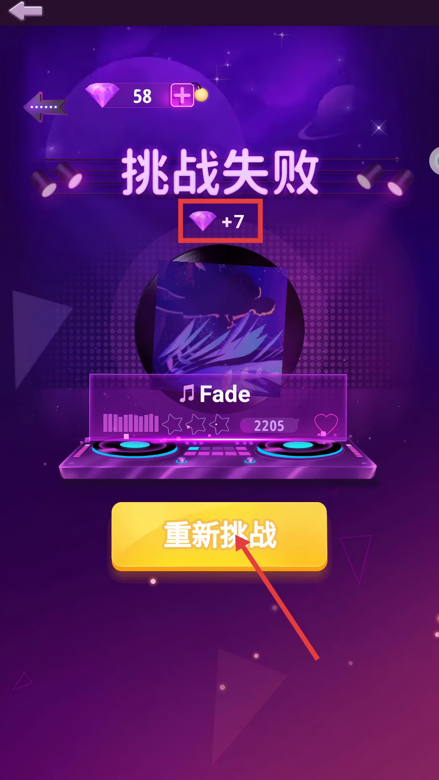 4、若挑战失败,会获得钻石奖励(如+7钻石),点击【重新挑战】按钮,可再次尝试该关卡。
