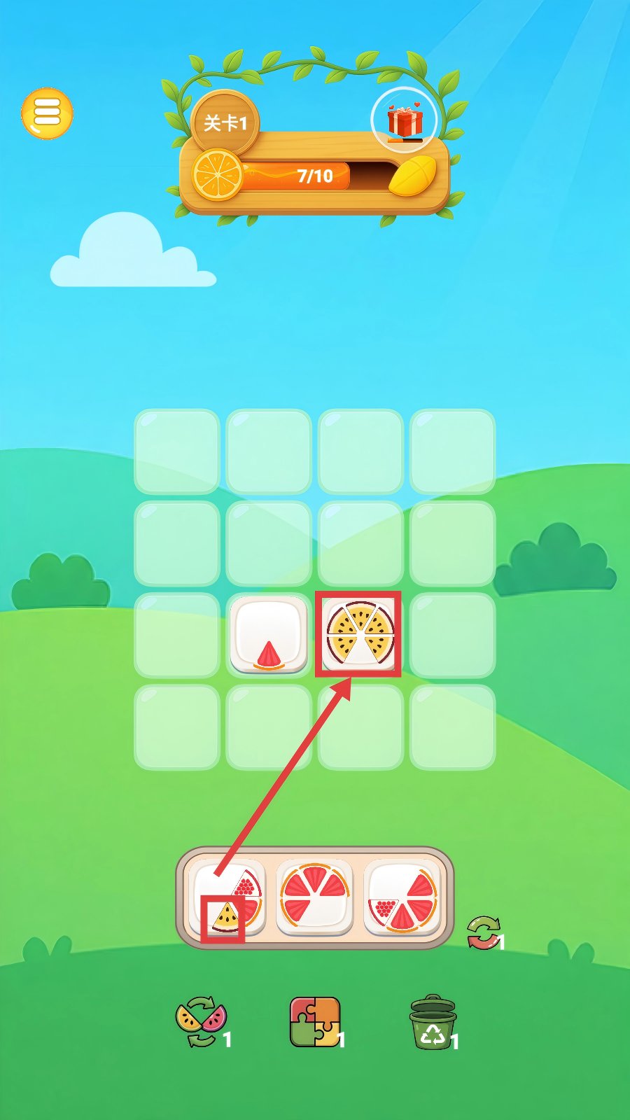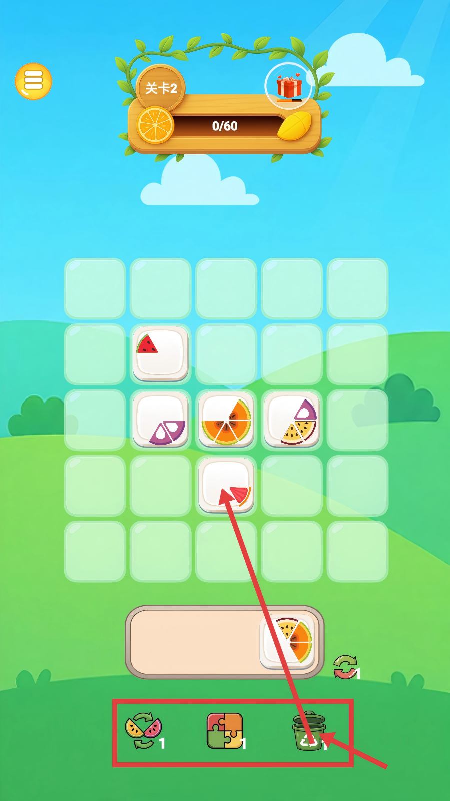 3、到【关卡2】时,若水果盘不合适,可利用下方的回收、拼图、垃圾桶道具,调整盘子以匹配网格需求。
