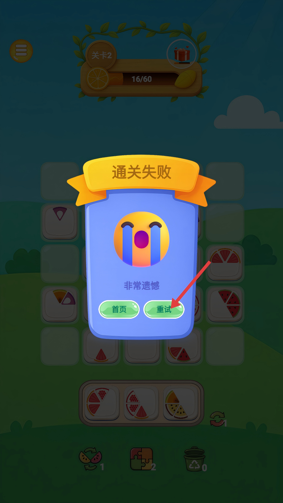 4、若出现【通关失败】,点击【重试】按钮,就能重新挑战当前关卡,继续尝试完成水果摆盘任务。
