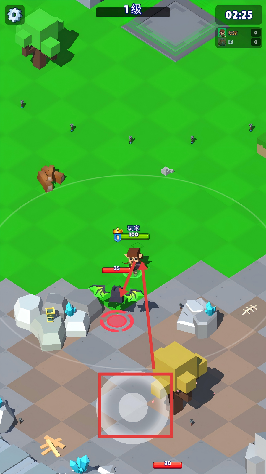 2、战斗时,操控角色移动,利用下方操作区域攻击血条显示为【35】的敌人,注意自身血量。