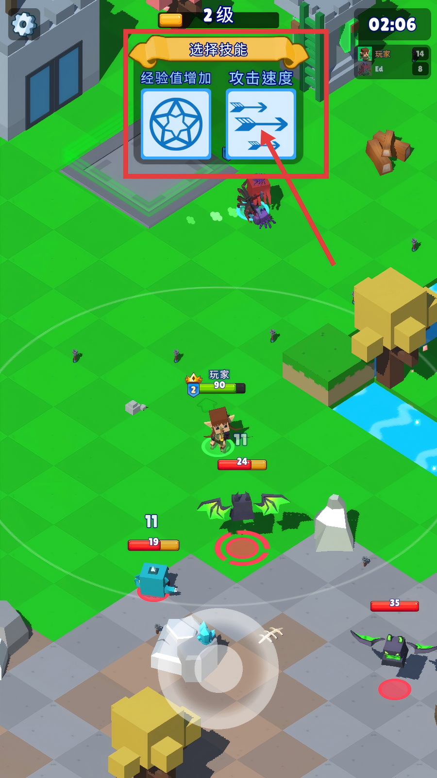 3、升级时会出现【选择技能】界面,可根据需求选【经验值增加】或【攻击速度】来强化角色。