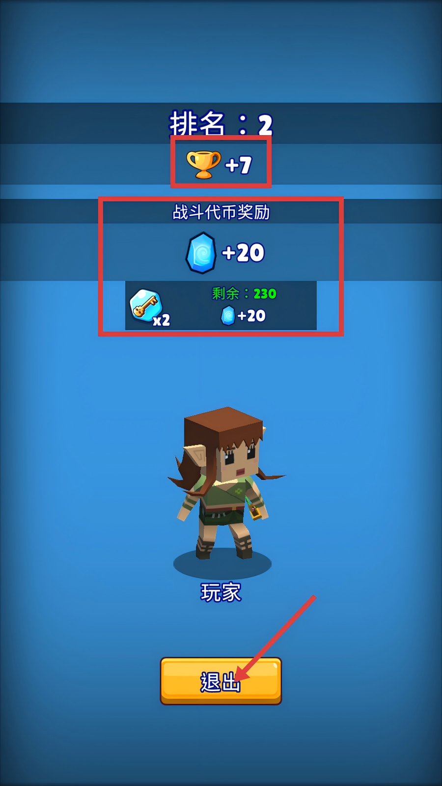 4、战斗结束后,会显示排名与奖励,获得【+7】奖杯和【+20】战斗代币等,之后点击【退出】即可。