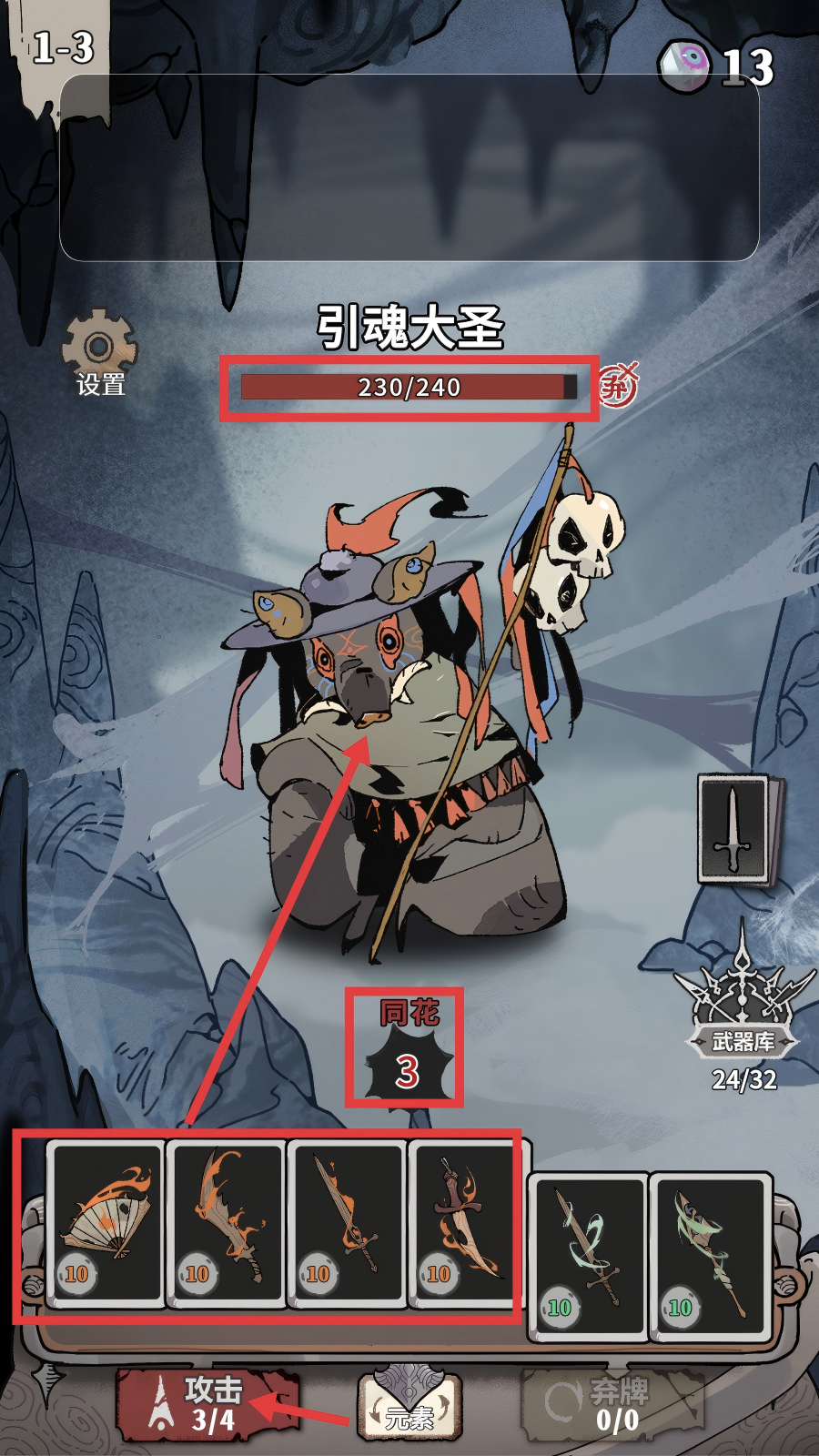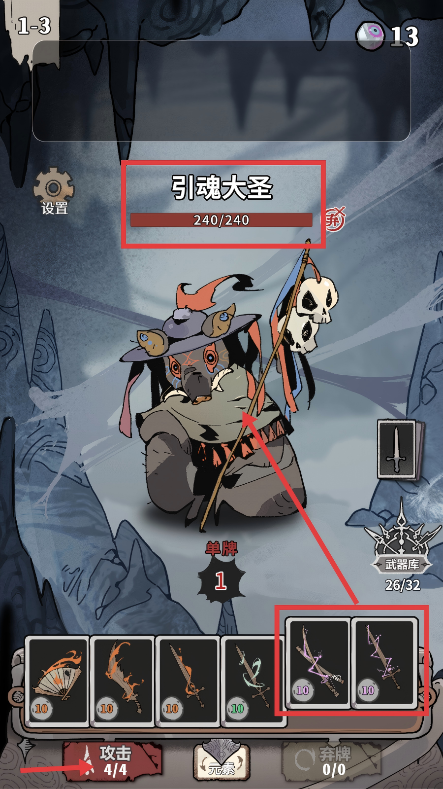 2、战斗时,观察手牌中的武器卡牌,如红色框选的卡牌,点击后选择【攻击】来对【引魂大圣】造成伤害。