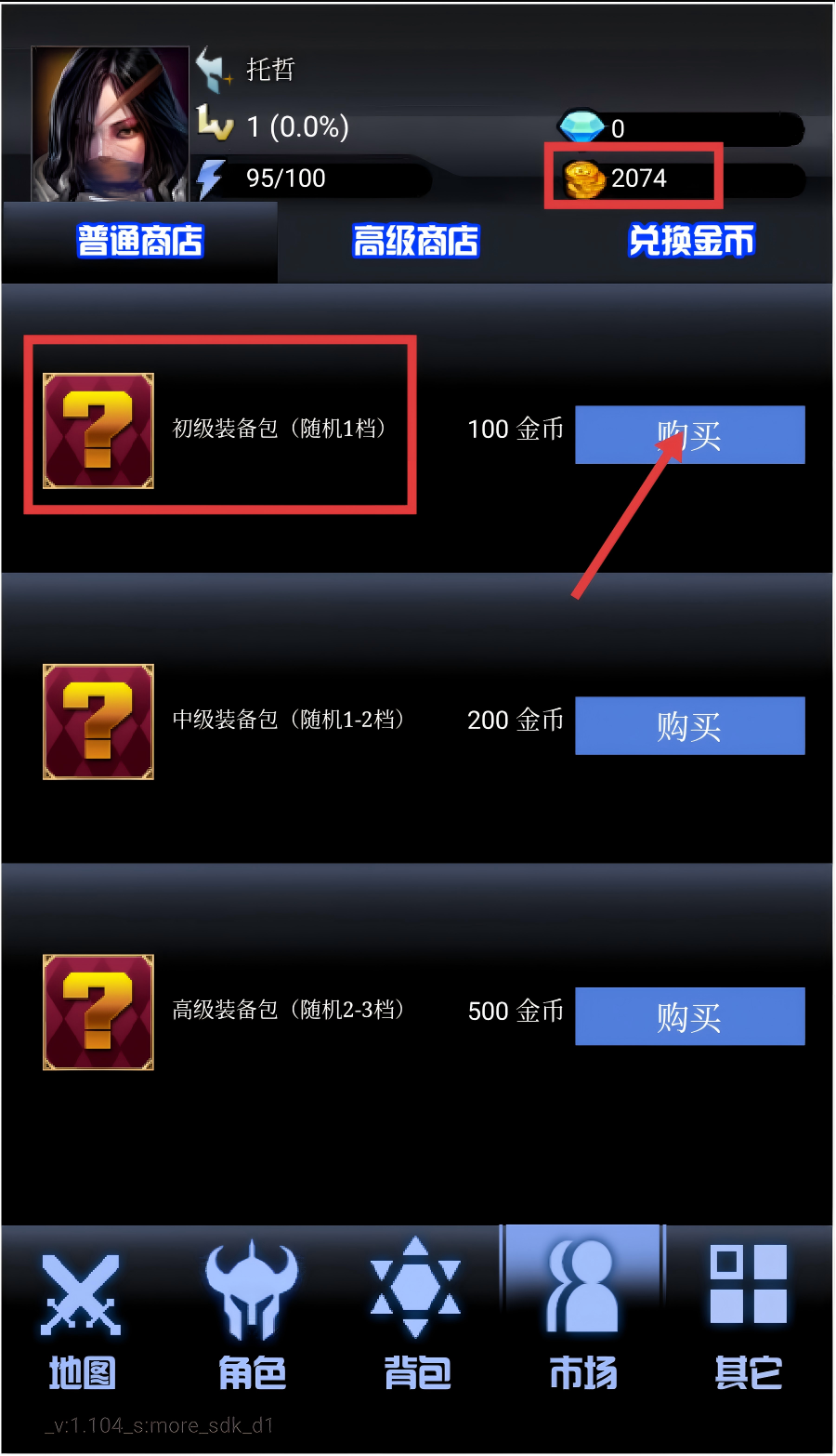 1、在商店界面,消耗100金币购买【初级装备包-(随机1档)】,获取初始装备来提升角色战力,为后续冒险做准备。