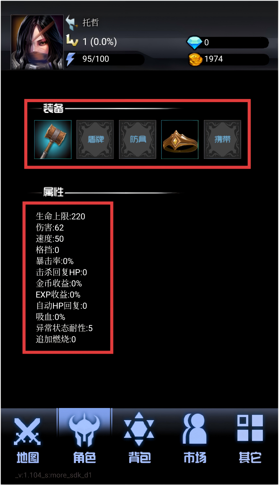 2、进入角色界面,查看装备栏的武器、戒指等装备,以及生命上限、伤害等属性数值,以此规划装备搭配与升级思路。