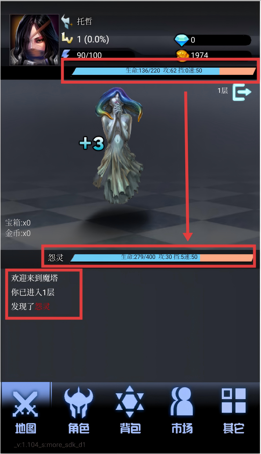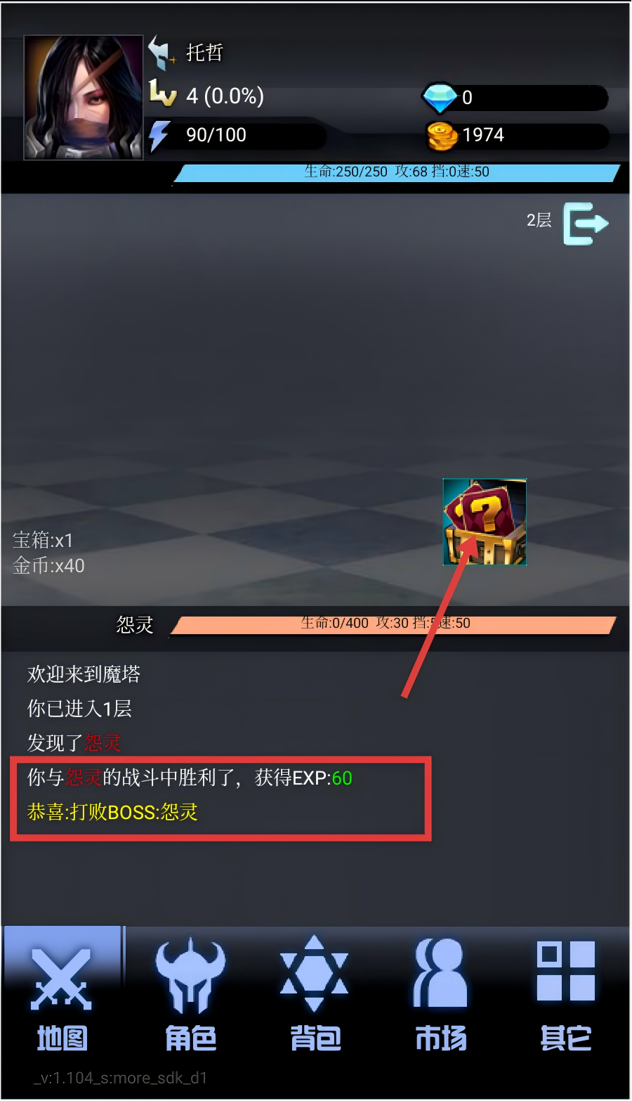 4、击败怨灵后,会获得EXP和宝箱奖励,等级提升的同时开启宝箱获取道具,随后可前往魔塔2层继续探索冒险。