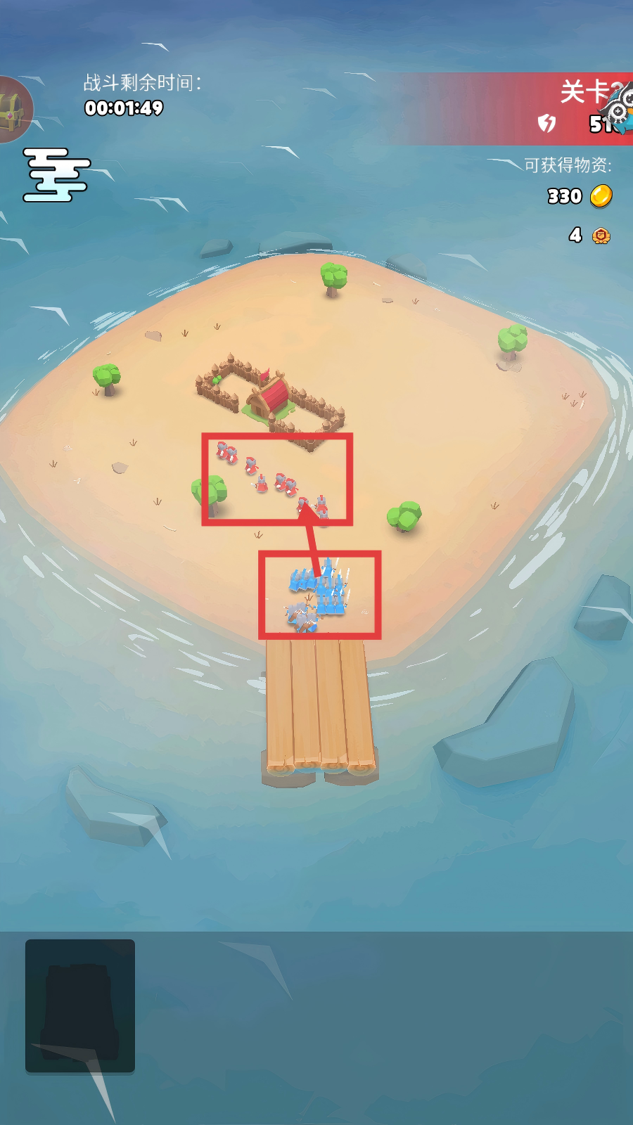 3、战斗中,指挥蓝色兵种部队向红色敌方部队发起进攻,利用兵种克制或数量优势,逐步推进占领岛屿。