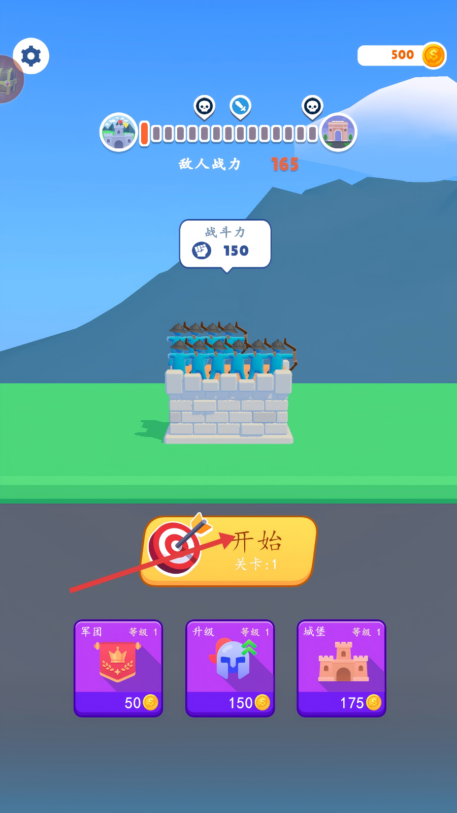 1、开战前先看【战斗力】数值,若低于【敌人战力】,可花金币升级【军团】【城堡】等提升战力再挑战。