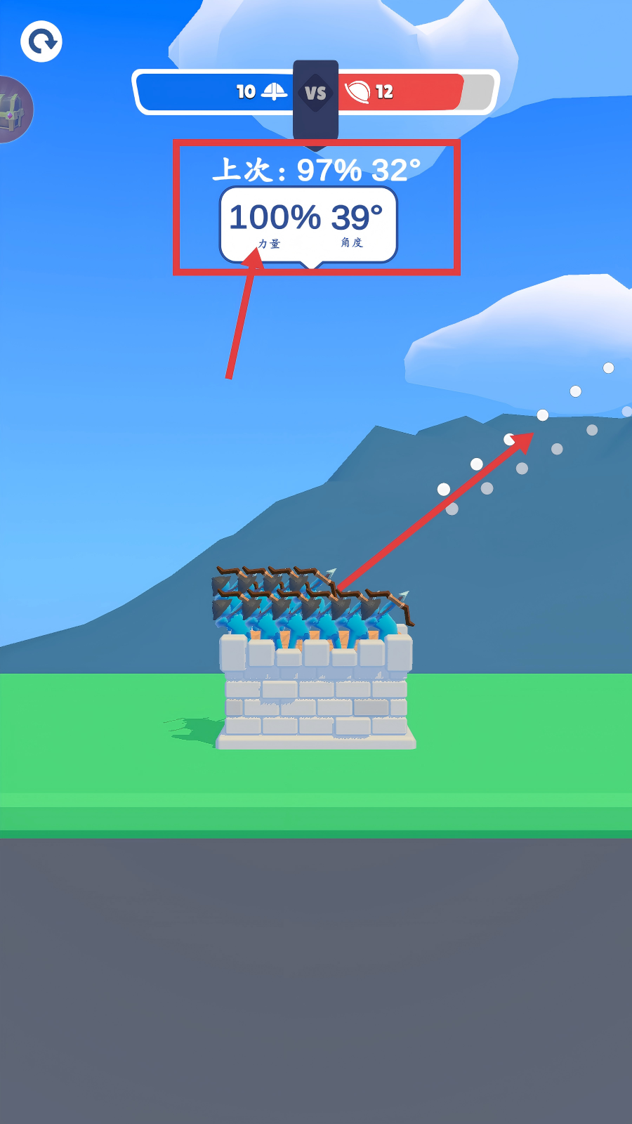 2、战斗时要留意【力量】和【角度】数值,调整到合适比例发射箭矢,才能更精准打击敌人。