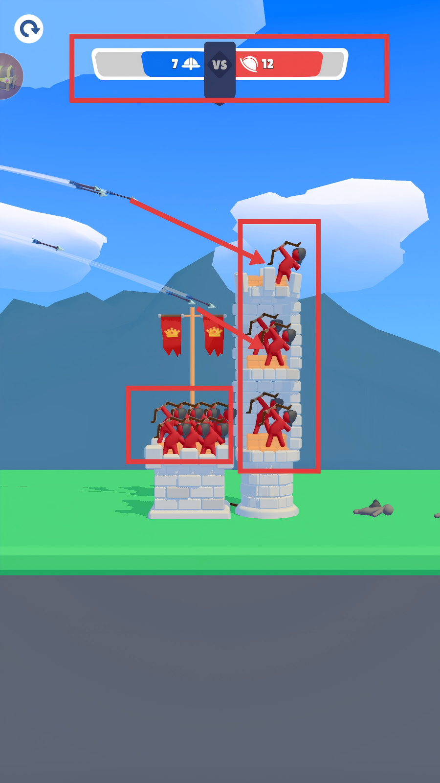 3、交战时优先瞄准敌方塔楼中聚集的单位,集中火力能快速削减敌方战力,扭转【7VS12】这类劣势局面。
