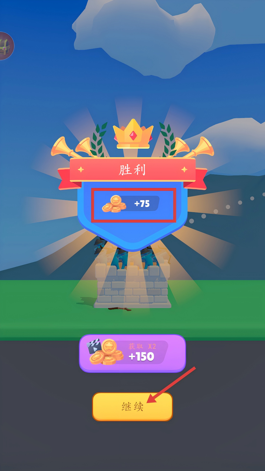 4、获胜后会获得金币奖励,可点击【继续】按钮进入下一关,也能看视频翻倍获取金币用于后续升级。