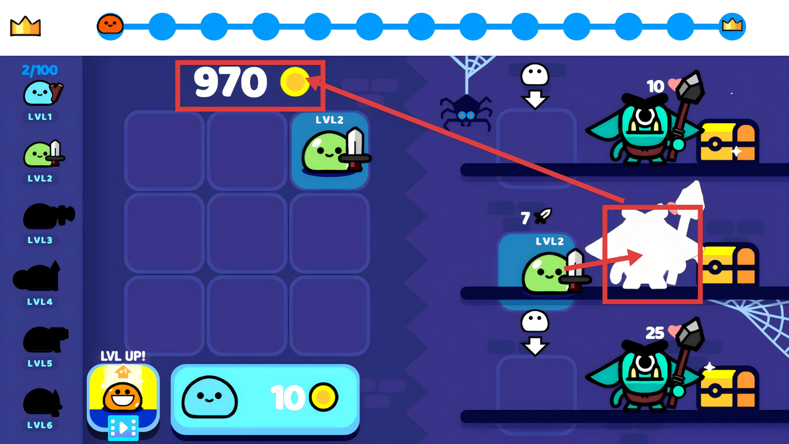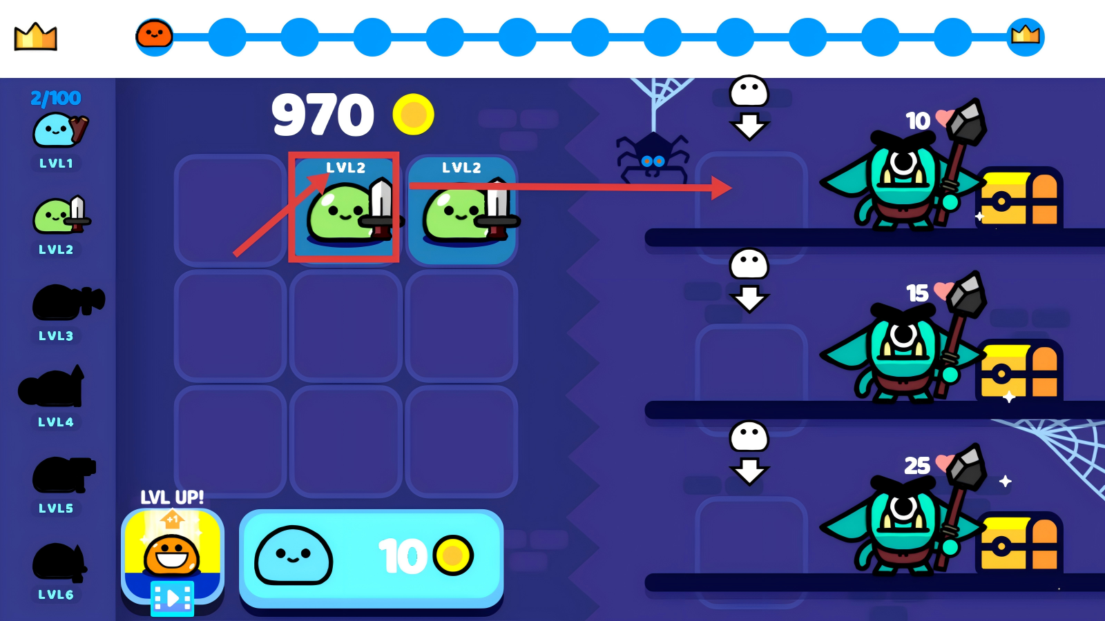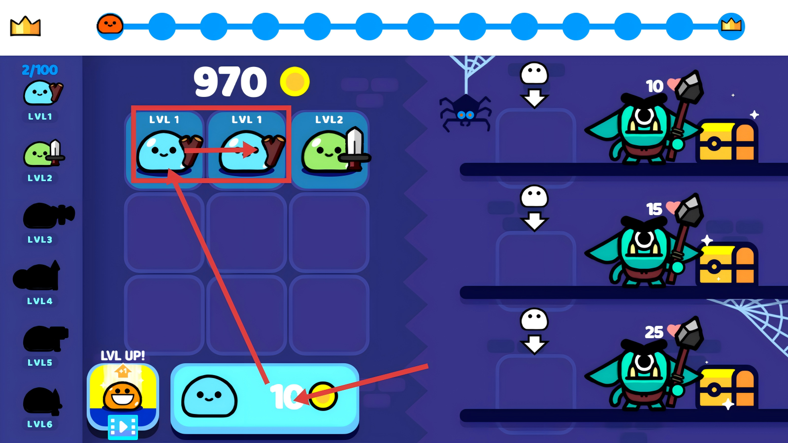 1、消耗10金币,将两个同等级(LVL1)的蓝色史莱姆合成,提升单位战力,为后续战斗做准备。