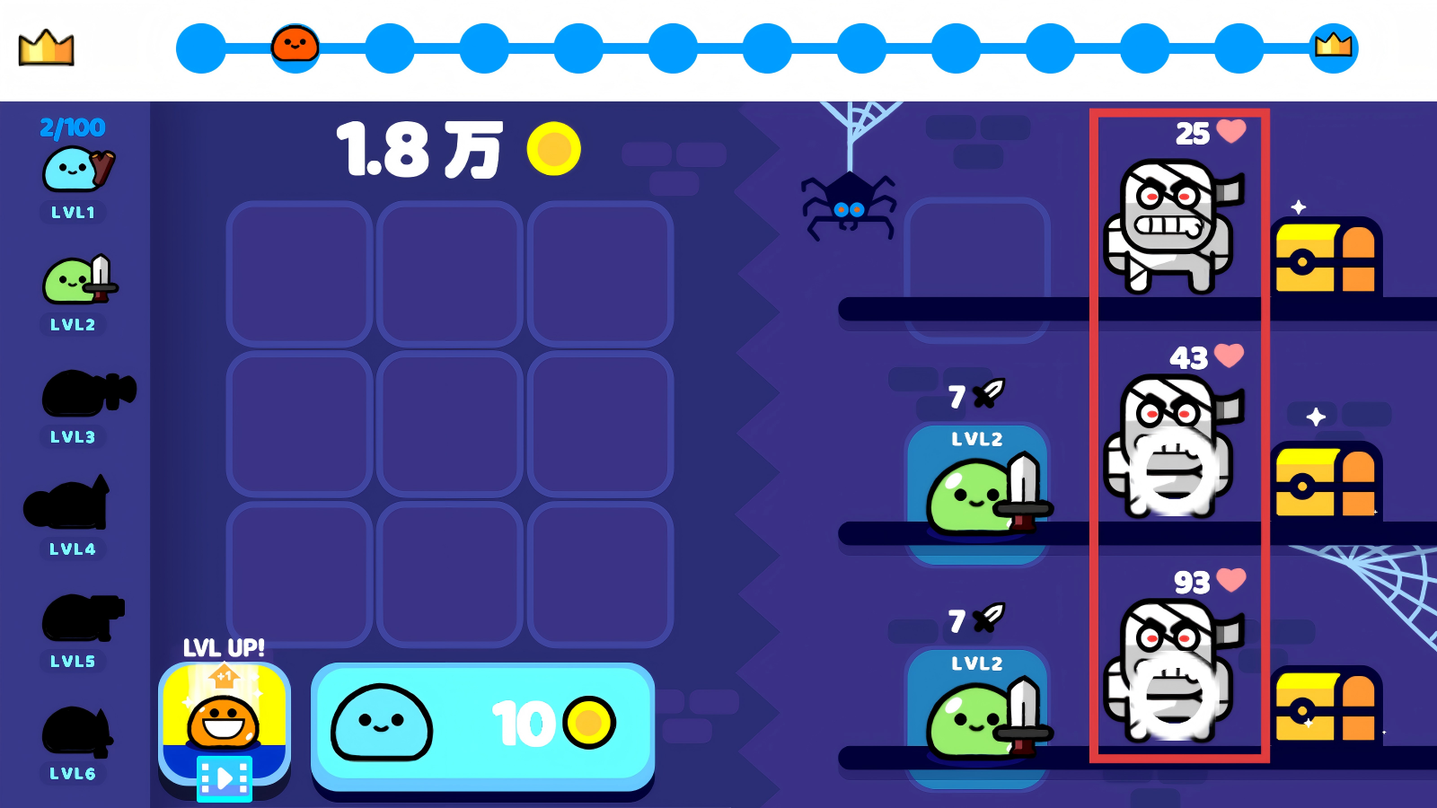 3、布置好的史莱姆会自动攻击敌人,击败敌人可获取金币,积累金币用于后续合成或升级。