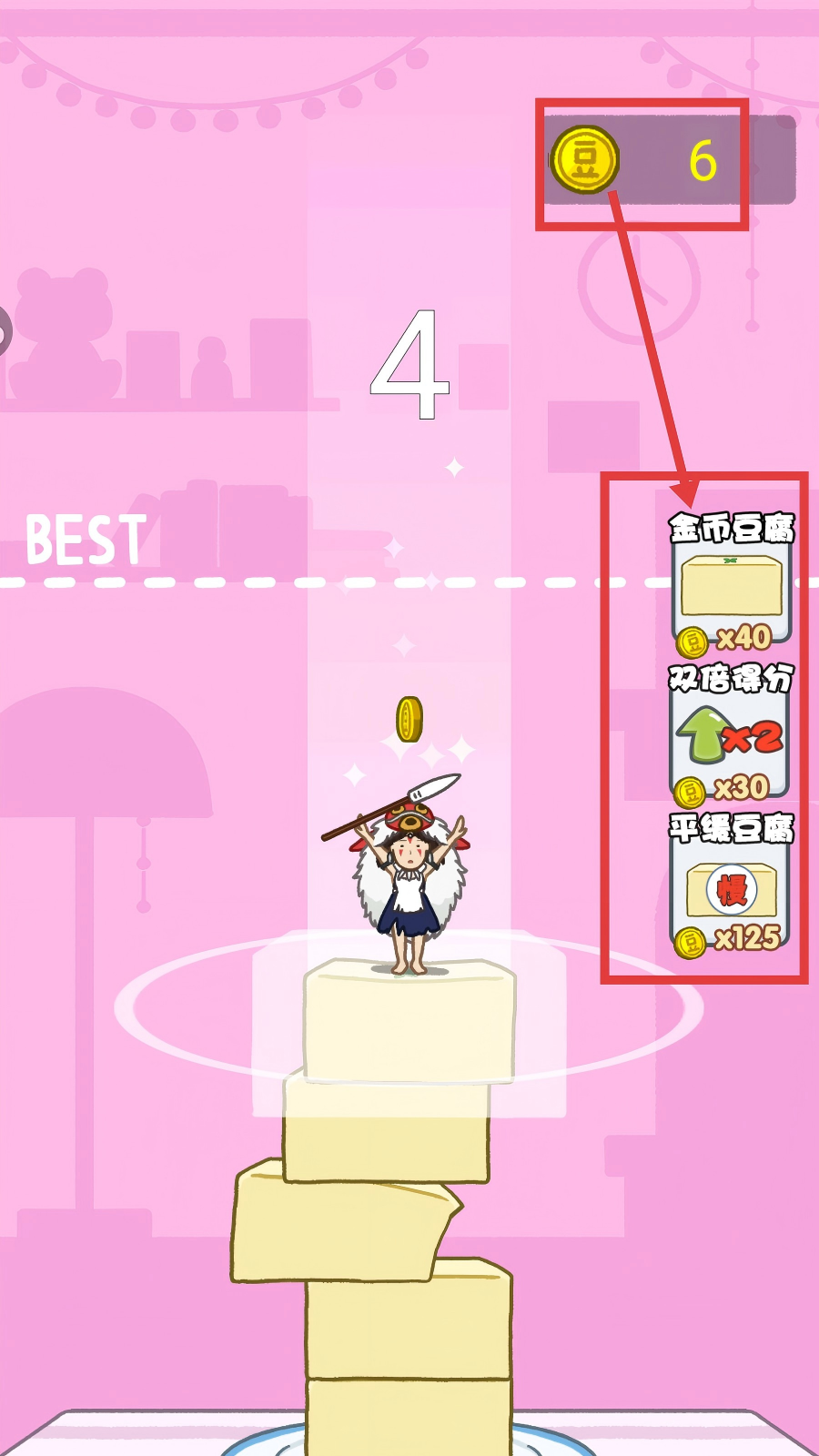 2、挑战中操控角色在豆腐上跳跃,精准跳到相邻豆腐上,过程中可获取金币,积累分数。