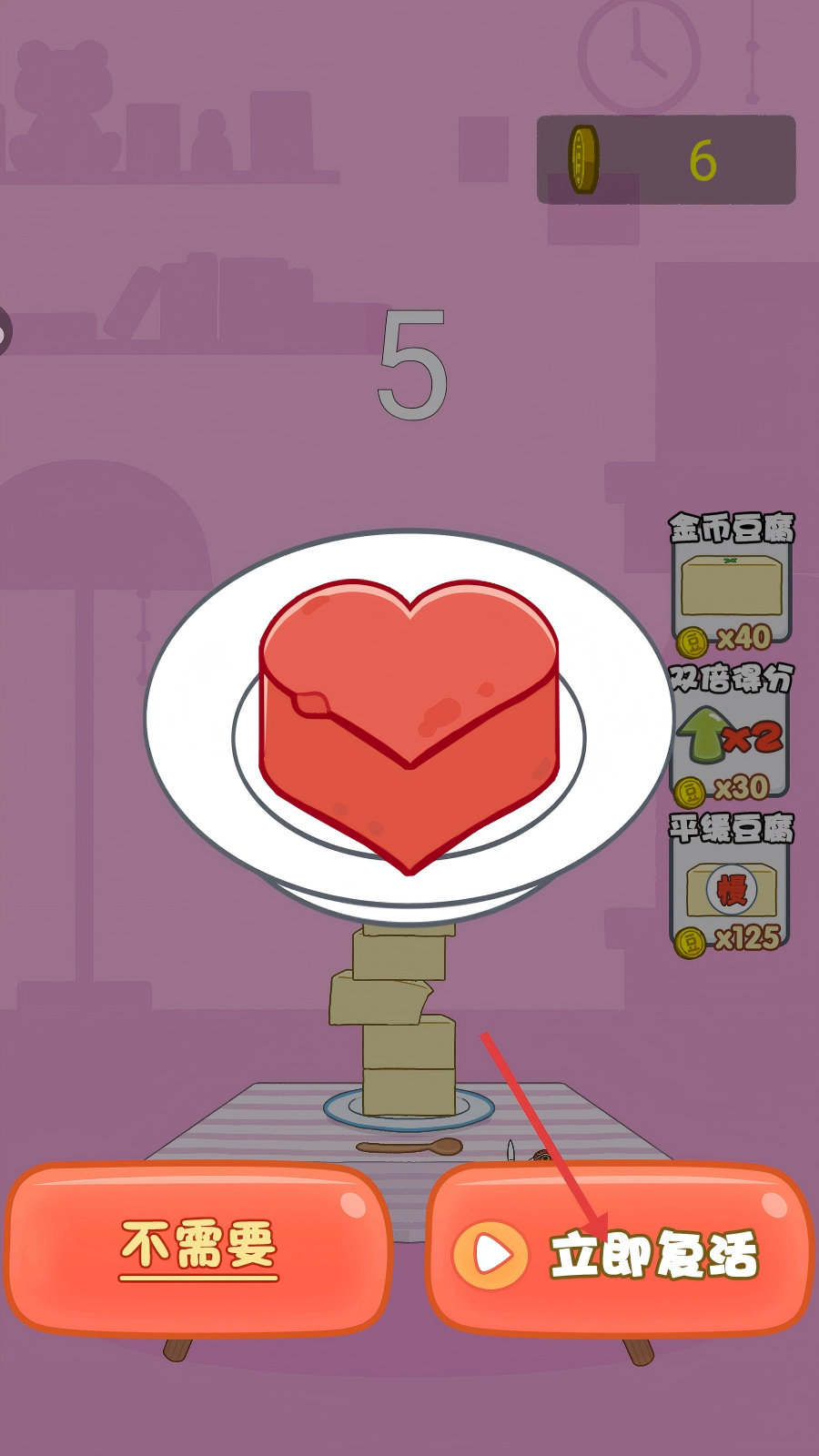 4、若挑战失败,可点击【立即复活】按钮,重新回到游戏继续堆叠豆腐,争取更高分数。