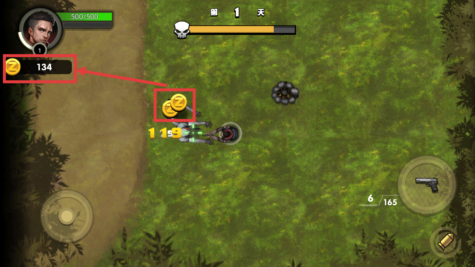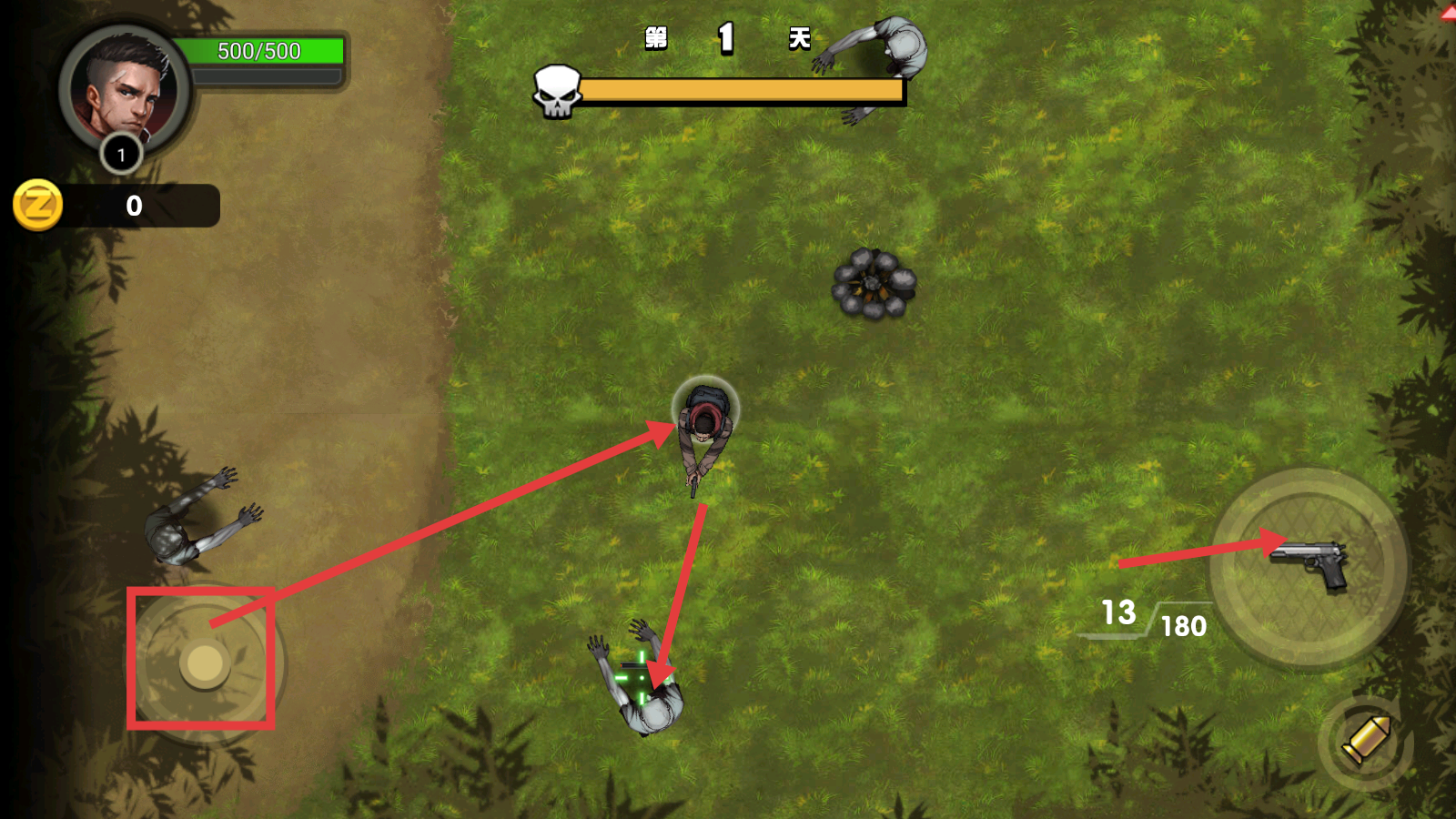 2、利用左侧摇杆移动角色,右侧手枪按钮射击敌人,同时留意左上角【500/500】的生命值状态。