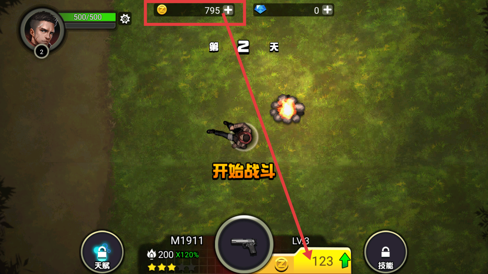 4、完成第1天战斗后进入第2天,可使用积累的金币(如界面显示的数量)升级武器,比如提升【M1911】的等级。