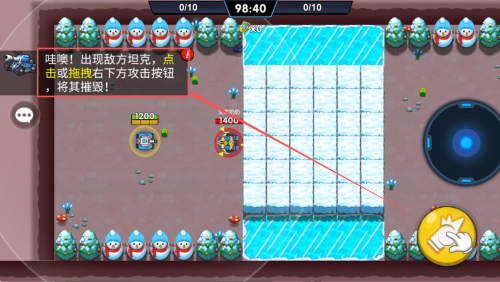 3、如何攻击敌人?当敌方坦克出现时,点击或拖拽右下方攻击按钮进行攻击。