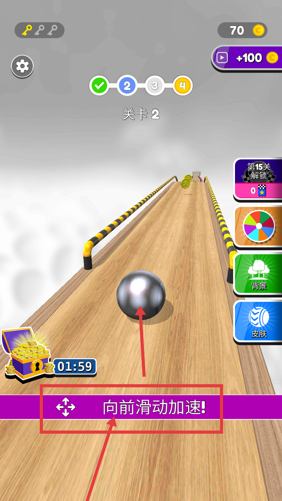1、关卡2-按照【向前滑动加速!】的提示,滑动屏幕让金属球加速前进,开启关卡挑战。