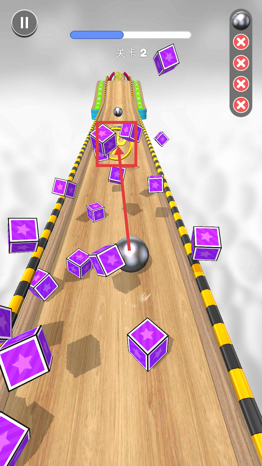 3、遇到紫色带星方块时,操控金属球撞击它们,清除障碍物的同时向关卡终点推进。