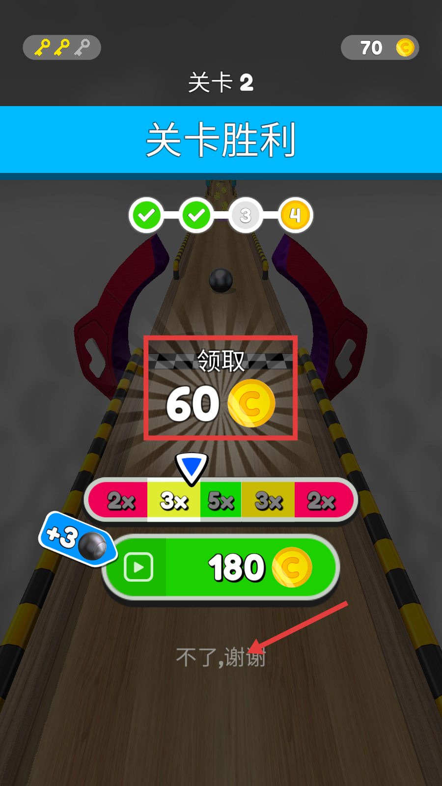 4、关卡胜利后,可领取【60】金币,若不想观看广告获取额外奖励,可选择【不了,谢谢】继续。