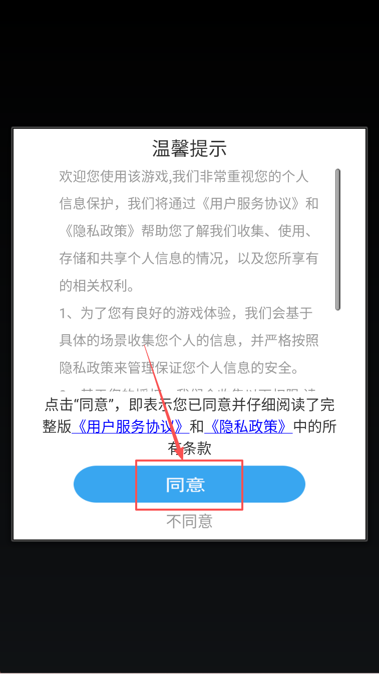 1、首先,阅读隐私弹窗并点击“同意”进入游戏。