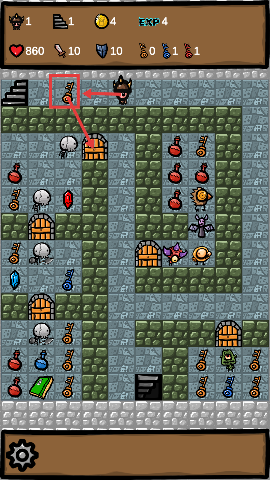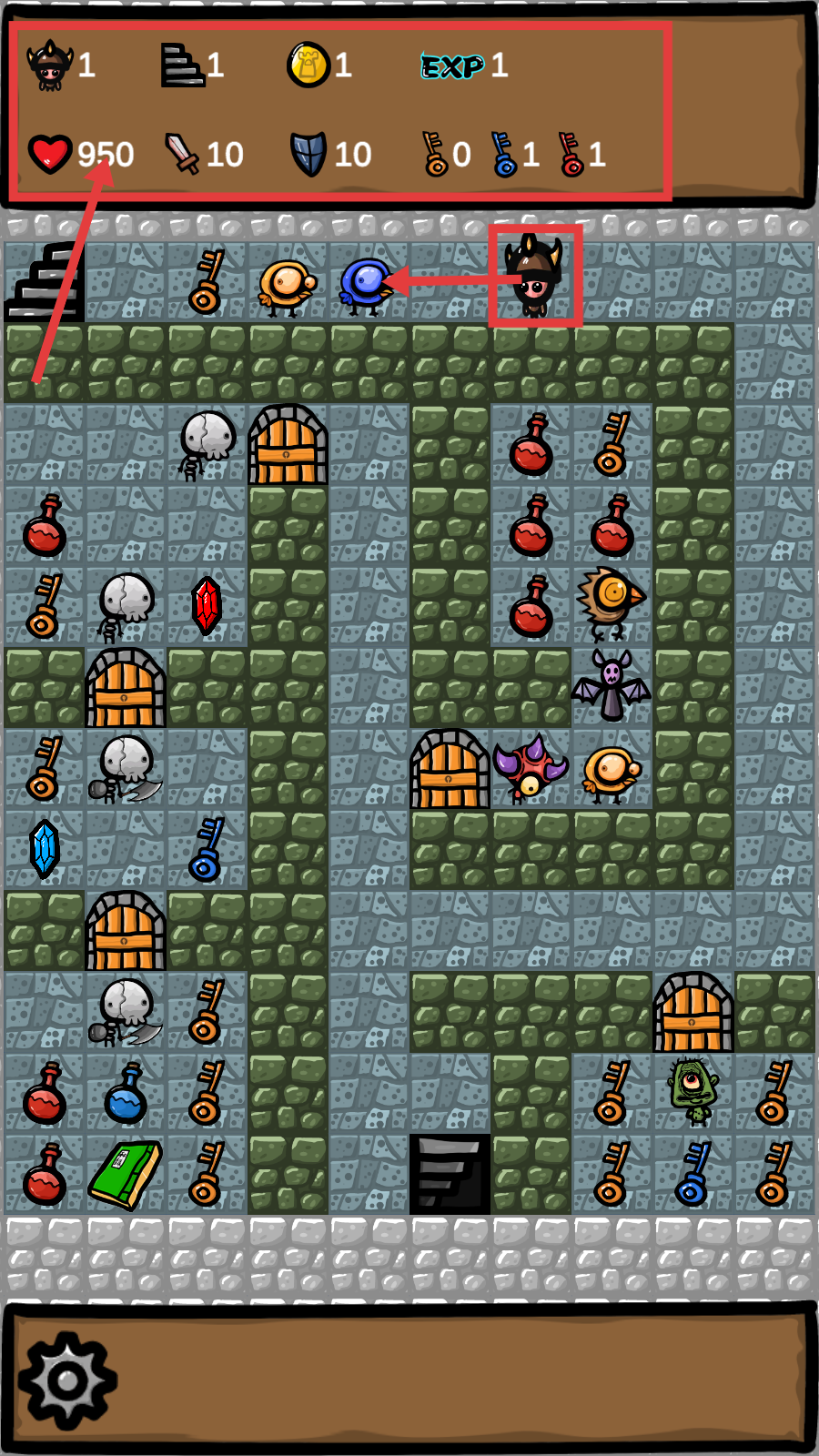 2、查看顶部属性栏【血量-950】【攻击-10】【防御-10】等,观察地图里怪物、钥匙、门的分布,规划移动路径。