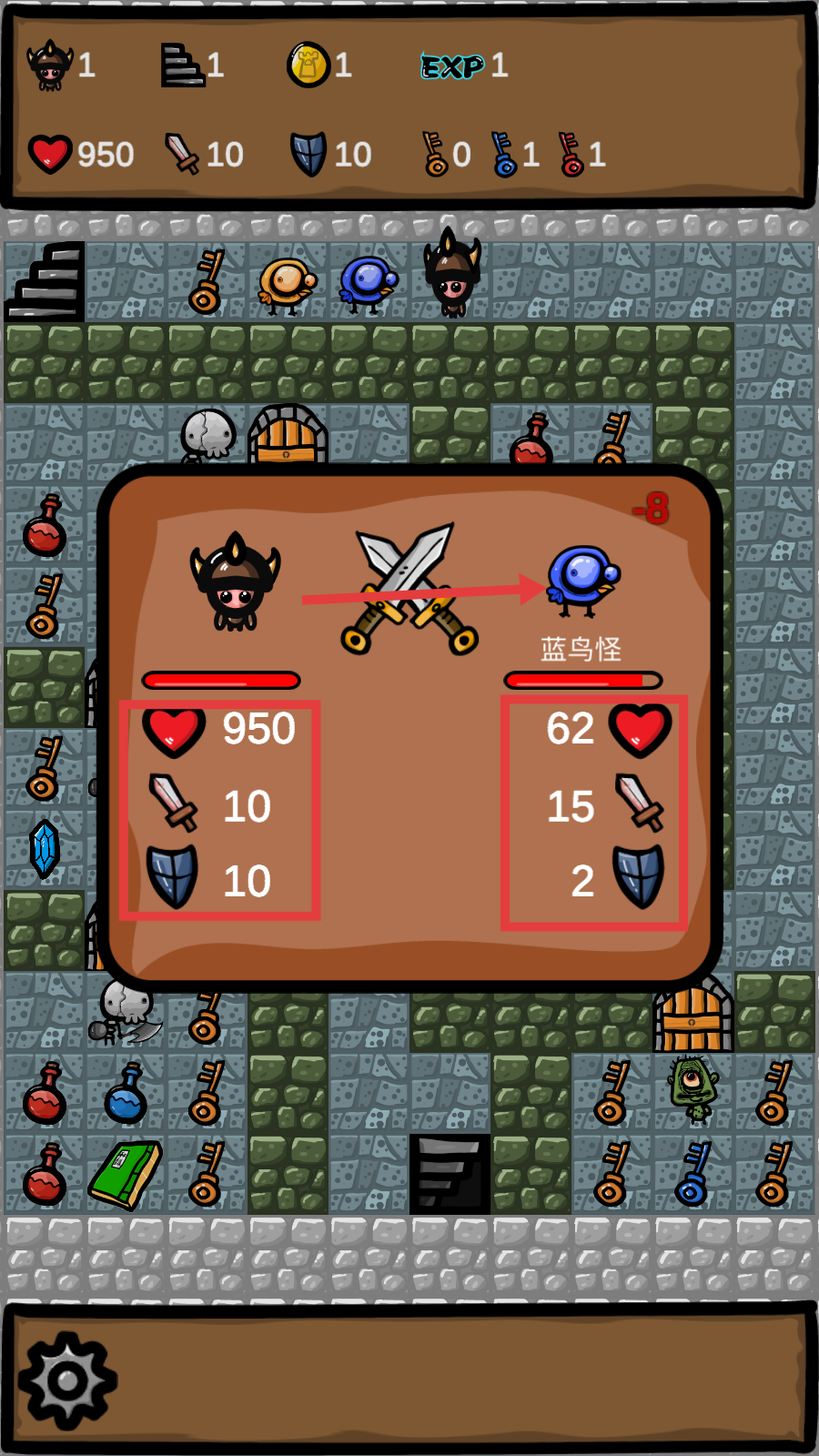 3、遭遇【蓝鸟怪】时,对比自身(血量950、攻击10、防御10)与怪物(血量62、攻击15、防御2)属性,判断战斗可行性。