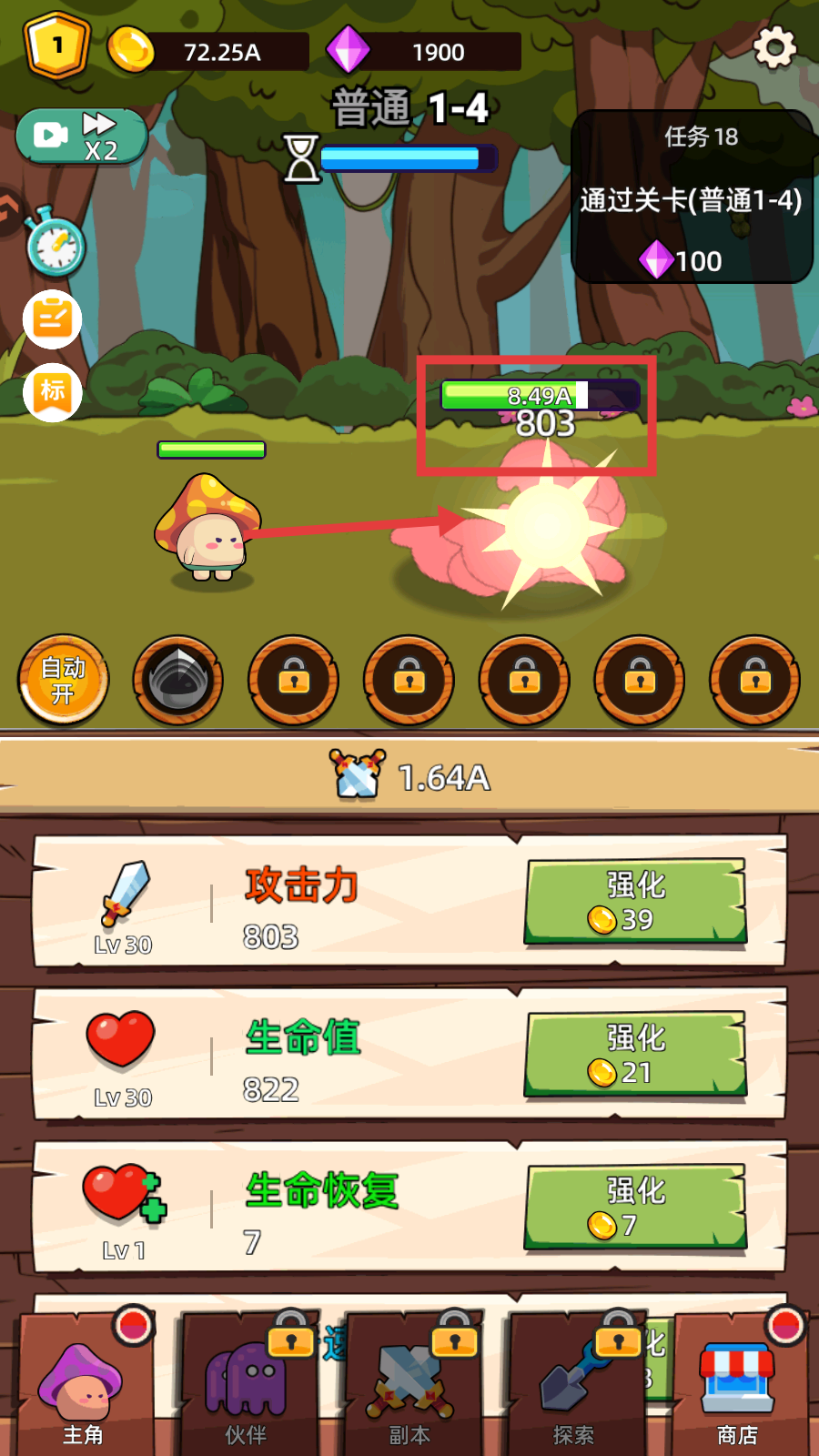 1、挑战【普通1-4】关卡时,操控蘑菇角色攻击敌人,关注敌人血量条,同时可查看下方攻击力、生命值等属性面板。