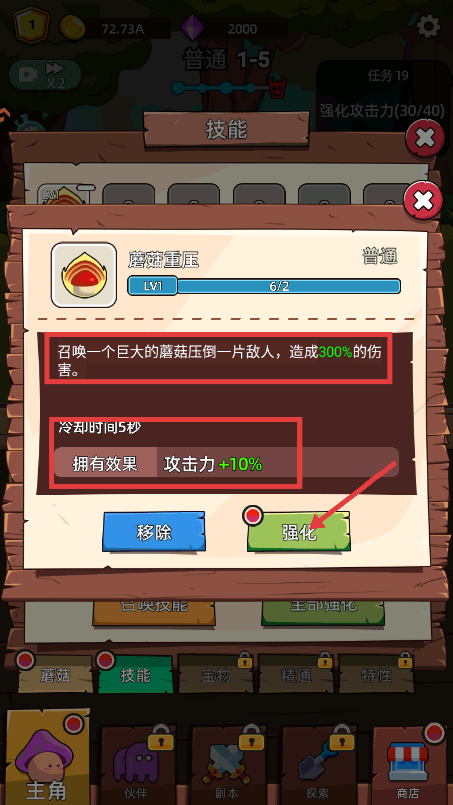 2、强化【蘑菇重压】技能,该技能可召唤巨大蘑菇压倒敌人造成300%伤害,还能让攻击力+10%,冷却时间5秒,提升战斗效率。