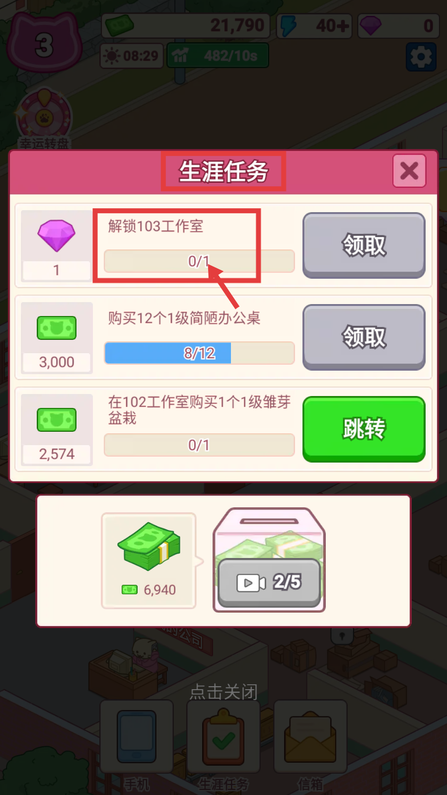 1、查看【生涯任务】,明确“解锁103工作室”等任务目标,依据任务指引推进游戏。