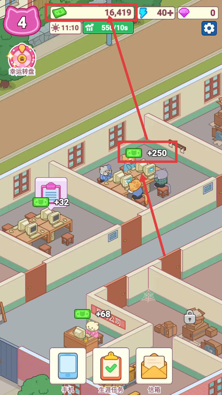 2、利用员工工作获取金币,像画面里显示的“+250”“+32”这类金币收益,积攒资金供后续建设使用。
