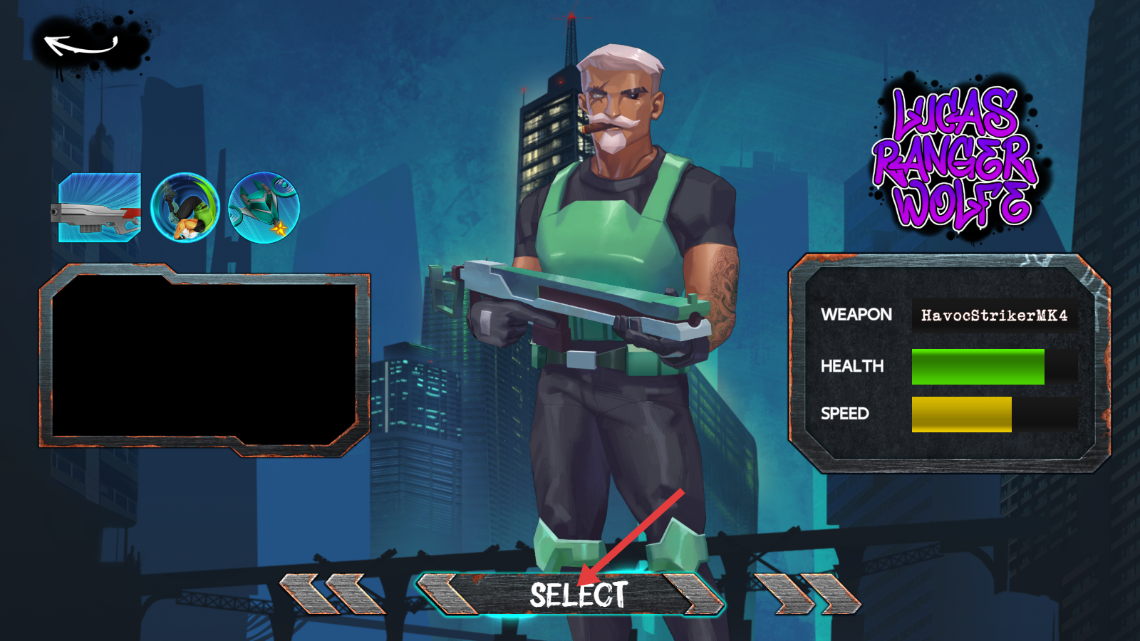 1、选择角色时,确认装备【HavocStrikerMK4】武器,查看【HEALTH】与【SPEED】属性,点击【SELECT】开启游戏。