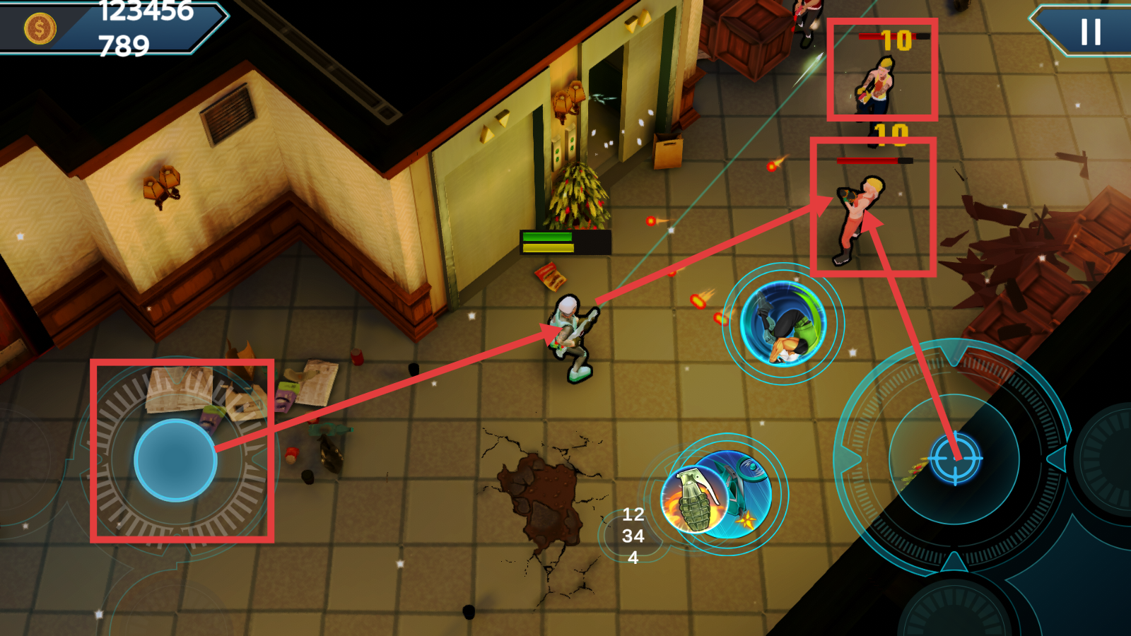 1、基础控制方法:使用虚拟摇杆实现角色移动和射击方向调整,简单操作快速上手,适合各种熟练度。