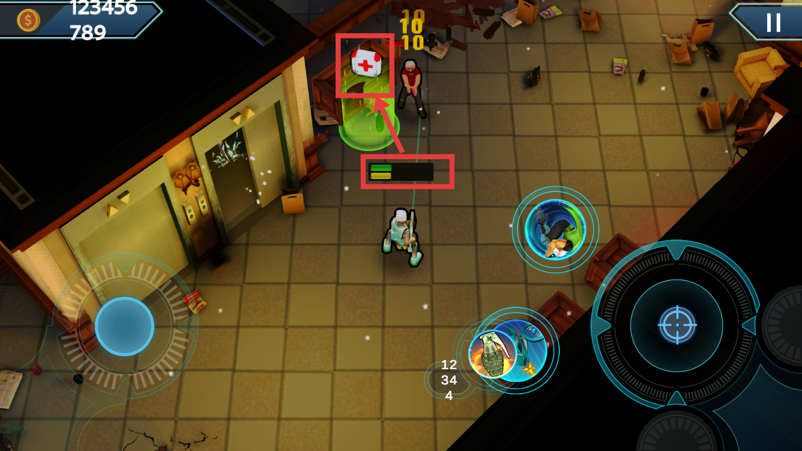 3、当【HEALTH】条减少,靠近带红十字的医疗包,补充生命值,维持充足血量以继续战斗。