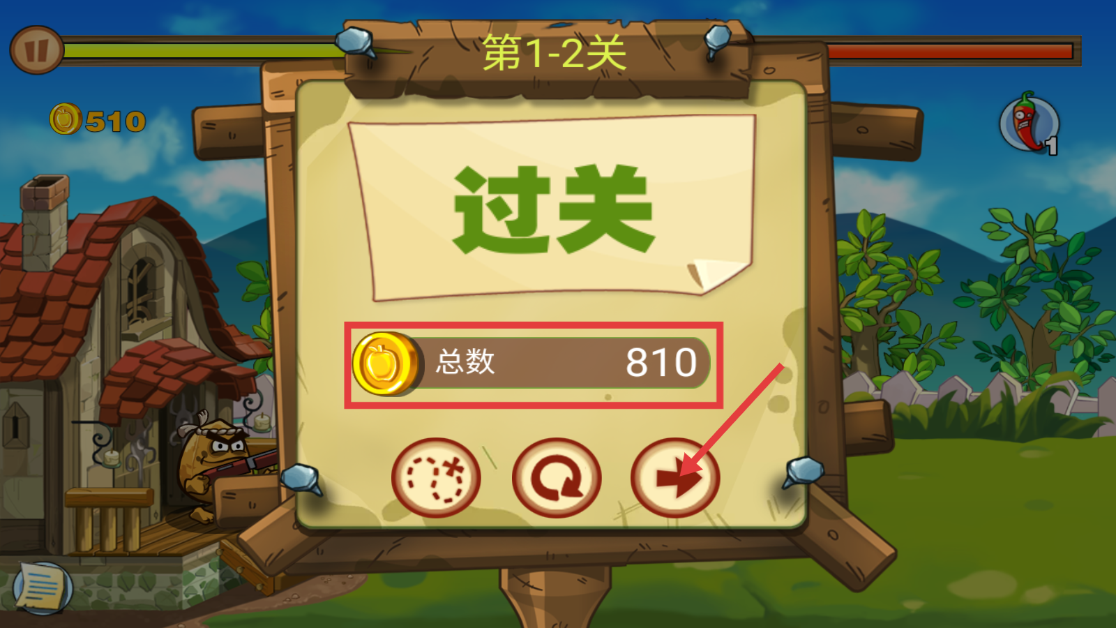 4、成功过关后,会获得金币奖励,点击带有箭头的按钮,即可继续挑战下一个关卡。