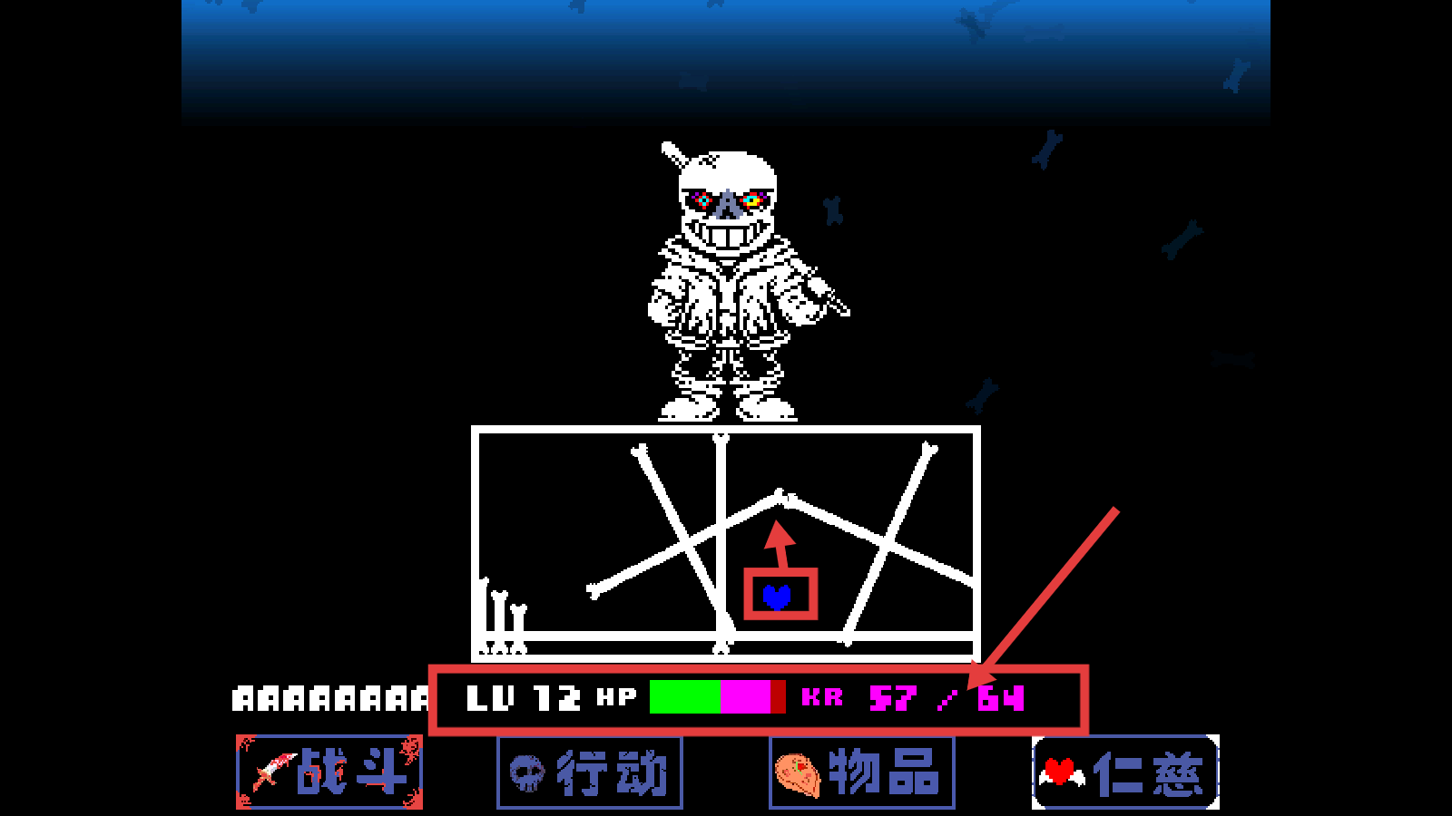 3、战斗过程中,操控心形图标躲避攻击,同时留意【HP】与【KR】数值变化,保障自身生存。