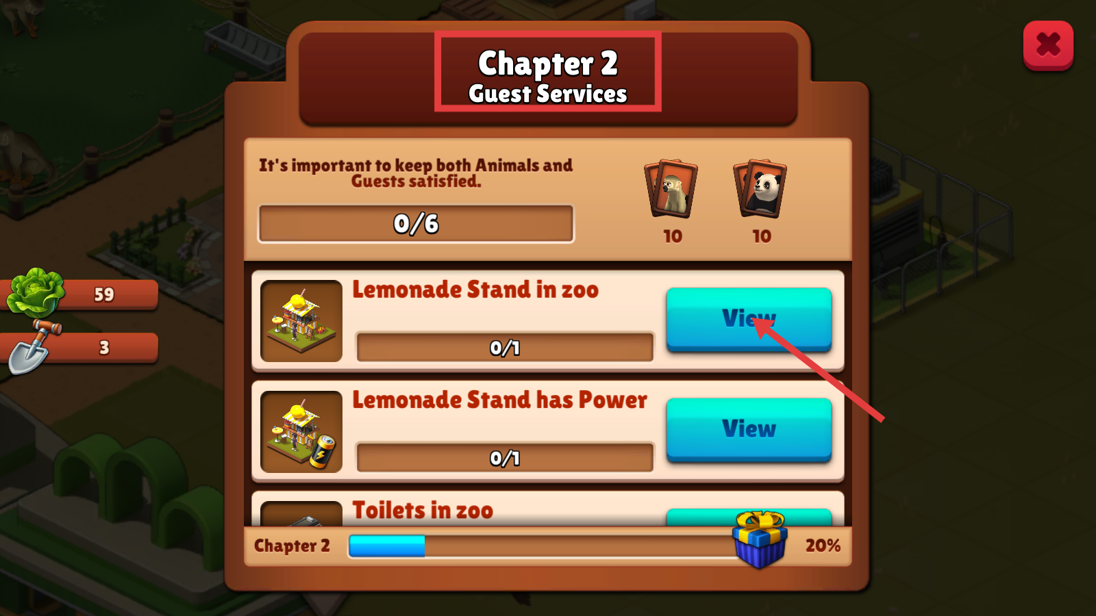 1、在【Chapter2-GuestServices】章节,点击【LemonadeStandinzoo】对应的【View】按钮,查看该设施的建造相关信息。
