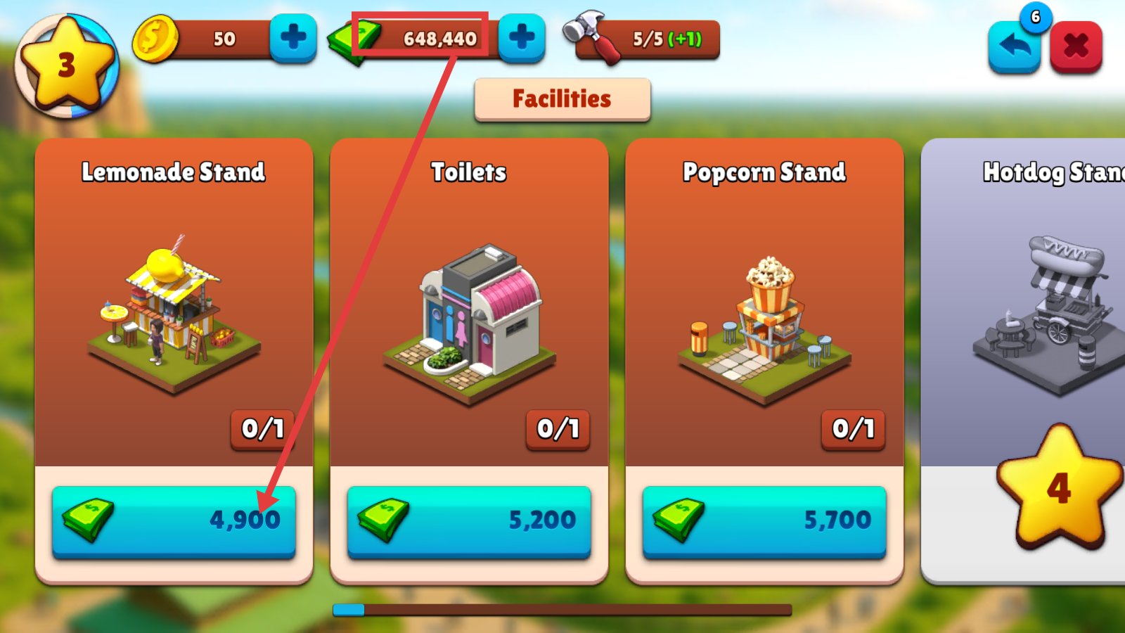 2、进入设施列表界面,花费4,900绿色钞票,可选择建造【LemonadeStand】,为动物园搭建服务设施。