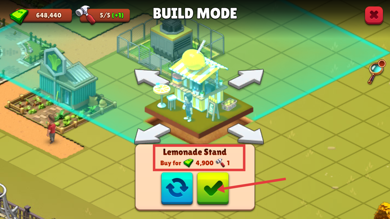 3、在【BUILDMODE】模式下,确定【LemonadeStand】的摆放位置后,点击绿色对勾按钮,完成该设施的建造操作。